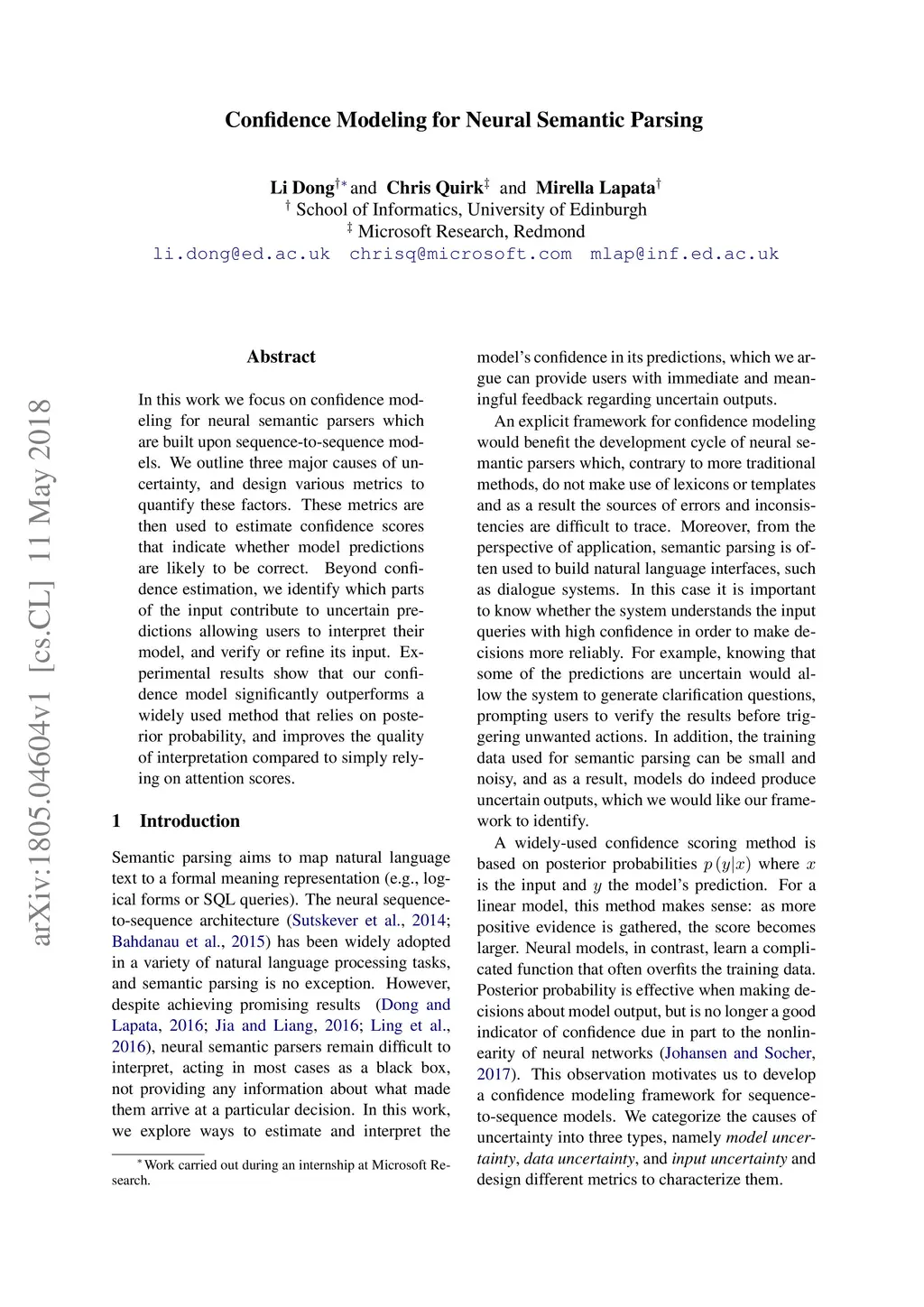 In this work we focus on confidence modeling for neural semantic parsers which are built upon sequence-to-sequence models. We outline three major causes of uncertainty, and design various metrics to quantify these factors. These metrics are then used to estimate confidence scores that indicate whether model predictions are likely to be correct. Beyond confidence estimation, we identify which parts of the input contribute to uncertain predictions allowing users to interpret their model, and verify or refine its input. Experimental results show that our confidence model significantly outperforms a widely used method that relies on posterior probability, and improves the quality of interpretation compared to simply relying on attention scores.