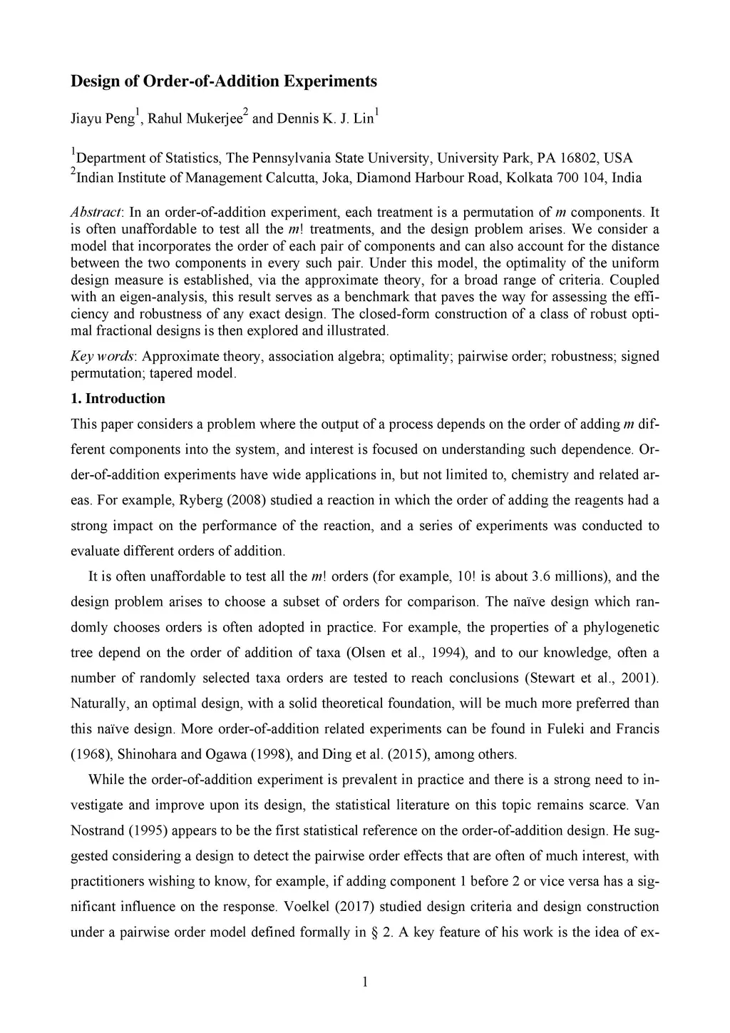 In an order-of-addition experiment, each treatment is a permutation of m components. It is often unaffordable to test all the m! treatments, and the design problem arises. We consider a model that incorporates the order of each pair of components and can also account for the distance between the two components in every such pair. Under this model, the optimality of the uniform design measure is established, via the approximate theory, for a broad range of criteria. Coupled with an eigen-analysis, this result serves as a benchmark that paves the way for assessing the efficiency and robustness of any exact design. The closed-form construction of a class of robust optimal fractional designs is then explored and illustrated.