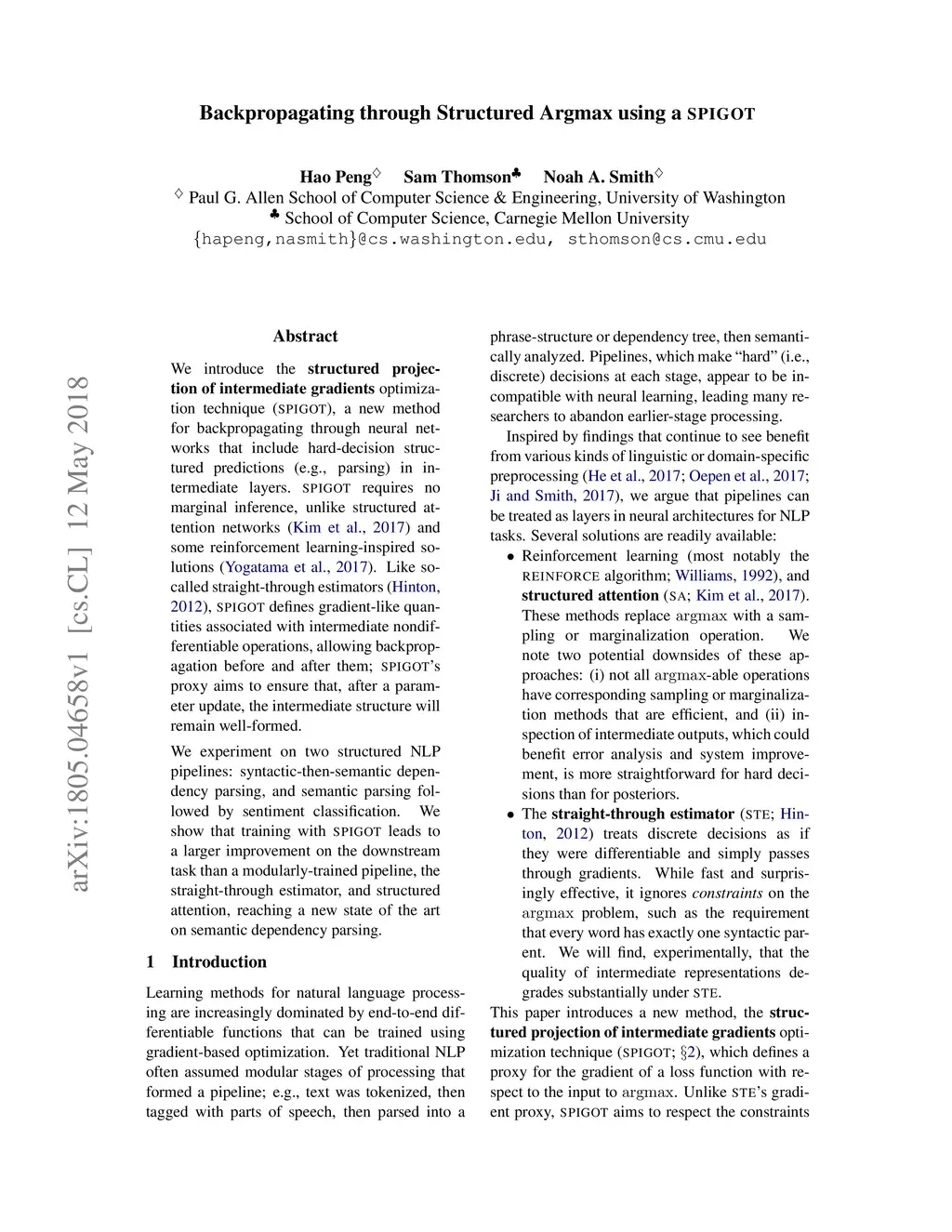 We introduce the structured projection of intermediate gradients optimization technique (SPIGOT), a new method for backpropagating through neural networks that include hard-decision structured predictions (e.g., parsing) in intermediate layers. SPIGOT requires no marginal inference, unlike structured attention networks (Kim et al., 2017) and some reinforcement learning-inspired solutions (Yogatama et al., 2017). Like so-called straight-through estimators (Hinton, 2012), SPIGOT defines gradient-like quantities associated with intermediate nondifferentiable operations, allowing backpropagation before and after them; SPIGOT's proxy aims to ensure that, after a parameter update, the intermediate structure will remain well-formed. We experiment on two structured NLP pipelines: syntactic-then-semantic dependency parsing, and semantic parsing followed by sentiment classification. We show that training with SPIGOT leads to a larger improvement on the downstream task than a modularly-trained pipeline, the straight-through estimator, and structured attention, reaching a new state of the art on semantic dependency parsing.