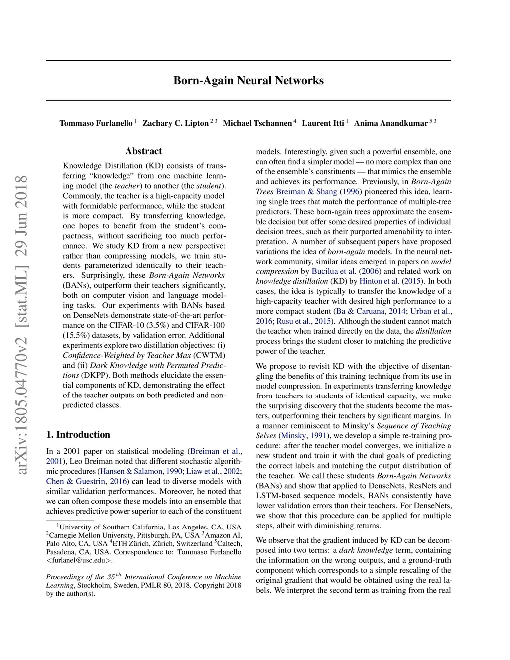 Knowledge Distillation (KD) consists of transferring “knowledge” from one machine learning model (the teacher) to another (the student). Commonly, the teacher is a high-capacity model with formidable performance, while the student is more compact. By transferring knowledge, one hopes to benefit from the student’s compactness, without sacrificing too much performance. We study KD from a new perspective: rather than compressing models, we train students parameterized identically to their teachers. Surprisingly, these Born-Again Networks (BANs), outperform their teachers significantly, both on computer vision and language modeling tasks. Our experiments with BANs based on DenseNets demonstrate state-of-the-art performance on the CIFAR-10 (3.5%) and CIFAR-100 (15.5%) datasets, by validation error. Additional experiments explore two distillation objectives: (i) Confidence-Weighted by Teacher Max (CWTM) and (ii) Dark Knowledge with Permuted Predictions (DKPP). Both methods elucidate the essential components of KD, demonstrating the effect of the teacher outputs on both predicted and non-predicted classes.