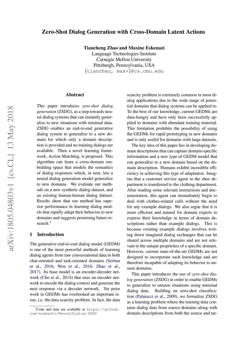 This paper introduces zero-shot dialog generation (ZSDG), as a step towards neural dialog systems that can instantly generalize to new situations with minimal data. ZSDG enables an end-to-end generative dialog system to generalize to a new domain for which only a domain description is provided and no training dialogs are available. Then a novel learning framework, Action Matching, is proposed. This algorithm can learn a cross-domain embedding space that models the semantics of dialog responses which, in turn, lets a neural dialog generation model generalize to new domains. We evaluate our methods on a new synthetic dialog dataset, and an existing human-human dialog dataset. Results show that our method has superior performance in learning dialog models that rapidly adapt their behavior to new domains and suggests promising future research.