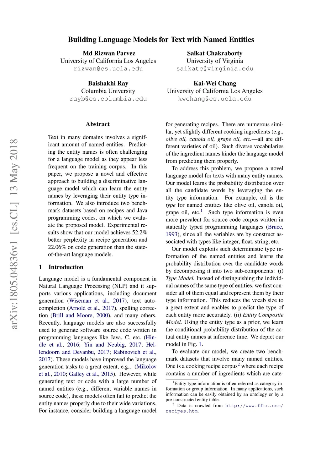 Text in many domains involves a significant amount of named entities. Predict- ing the entity names is often challenging for a language model as they appear less frequent on the training corpus. In this paper, we propose a novel and effective approach to building a discriminative language model which can learn the entity names by leveraging their entity type information. We also introduce two benchmark datasets based on recipes and Java programming codes, on which we evalu- ate the proposed model. Experimental re- sults show that our model achieves 52.2% better perplexity in recipe generation and 22.06% on code generation than the state-of-the-art language models.