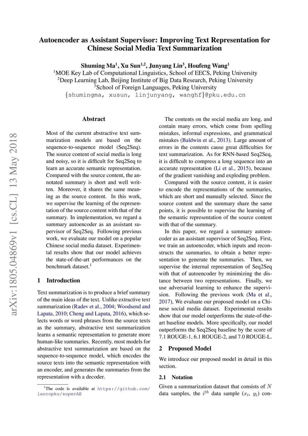 Most of the current abstractive text summarization models are based on the sequence-to-sequence model (Seq2Seq). The source content of social media is long and noisy, so it is difficult for Seq2Seq to learn an accurate semantic representation. Compared with the source content, the annotated summary is short and well written. Moreover, it shares the same meaning as the source content. In this work, we supervise the learning of the representation of the source content with that of the summary. In implementation, we regard a summary autoencoder as an assistant supervisor of Seq2Seq. Following previous work, we evaluate our model on a popular Chinese social media dataset. Experimental results show that our model achieves the state-of-the-art performances on the benchmark dataset.