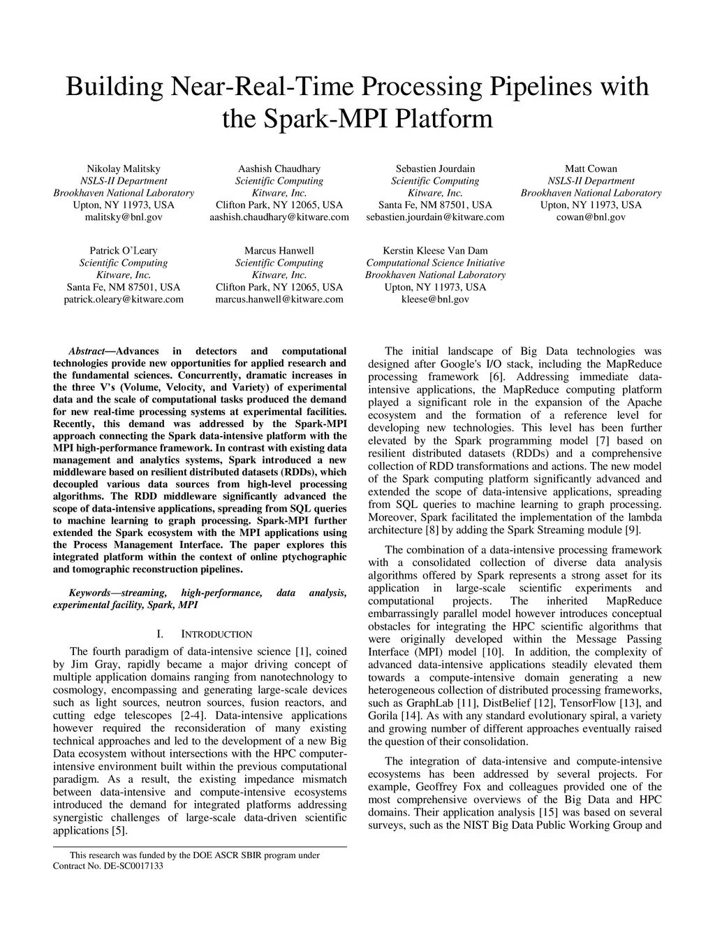 Advances in detectors and computational technologies provide new opportunities for applied research and the fundamental sciences. Concurrently, dramatic increases in the three Vs (Volume, Velocity, and Variety) of experimental data and the scale of computational tasks produced the demand for new real-time processing systems at experimental facilities. Recently, this demand was addressed by the Spark-MPI approach connecting the Spark data-intensive platform with the MPI high-performance framework. In contrast with existing data management and analytics systems, Spark introduced a new middleware based on resilient distributed datasets (RDDs), which decoupled various data sources from high-level processing algorithms. The RDD middleware significantly advanced the scope of data-intensive applications, spreading from SQL queries to machine learning to graph processing. Spark-MPI further extended the Spark ecosystem with the MPI applications using the Process Management Interface. The paper explores this integrated platform within the context of online ptychographic and tomographic reconstruction pipelines.