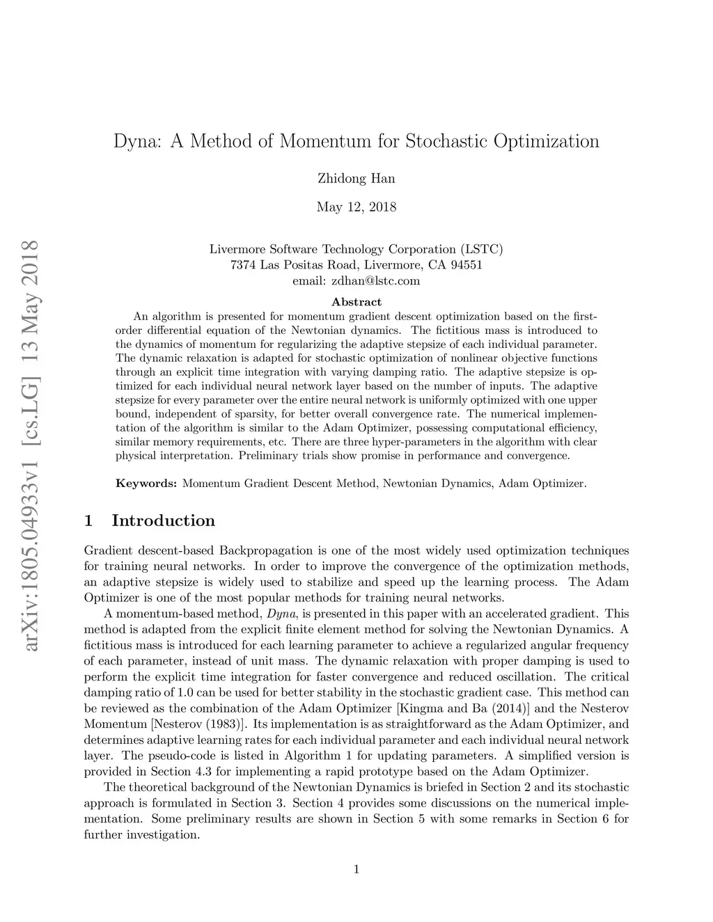 An algorithm is presented for momentum gradient descent optimization based on the first-order differential equation of the Newtonian dynamics. The fictitious mass is introduced to the dynamics of momentum for regularizing the adaptive stepsize of each individual parameter. The dynamic relaxation is adapted for stochastic optimization of nonlinear objective functions through an explicit time integration with varying damping ratio. The adaptive stepsize is optimized for each individual neural network layer based on the number of inputs. The adaptive stepsize for every parameter over the entire neural network is uniformly optimized with one upper bound, independent of sparsity, for better overall convergence rate. The numerical implementation of the algorithm is similar to the Adam Optimizer, possessing computational efficiency, similar memory requirements, etc. There are three hyper-parameters in the algorithm with clear physical interpretation. Preliminary trials show promise in performance and convergence.