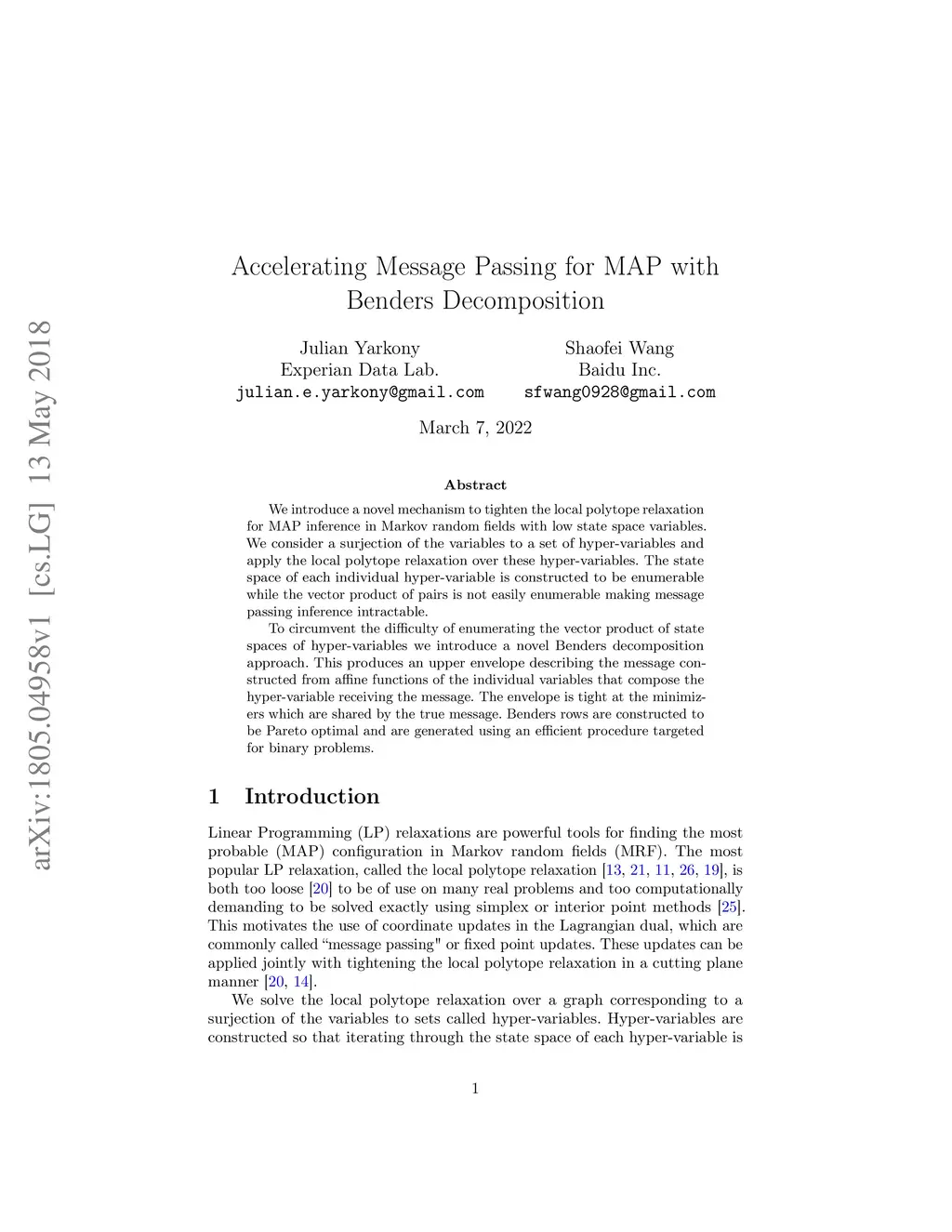 We introduce a novel mechanism to tighten the local polytope relaxation for MAP inference in Markov random fields with low state space variables. We consider a surjection of the variables to a set of hyper-variables and apply the local polytope relaxation over these hyper-variables. The state space of each individual hyper-variable is constructed to be enumerable while the vector product of pairs is not easily enumerable making message passing inference intractable. To circumvent the difficulty of enumerating the vector product of state spaces of hyper-variables we introduce a novel Benders decomposition approach. This produces an upper envelope describing the message constructed from affine functions of the individual variables that compose the hyper-variable receiving the message. The envelope is tight at the minimizers which are shared by the true message. Benders rows are constructed to be Pareto optimal and are generated using an efficient procedure targeted for binary problems.