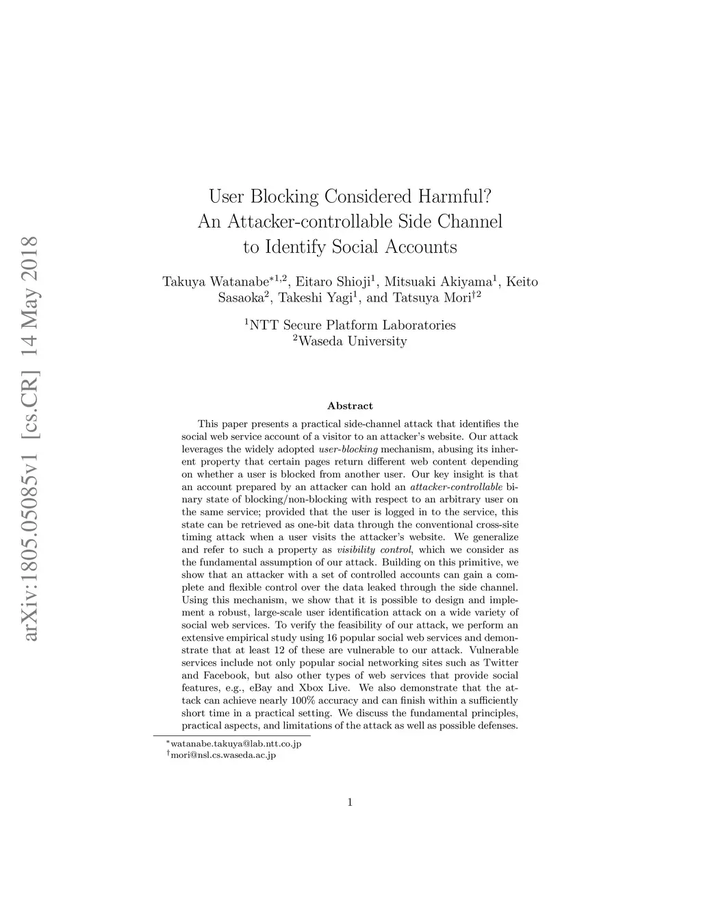 This paper presents a practical side-channel attack that identifies the social web service account of a visitor to an attacker's website. Our attack leverages the widely adopted user-blocking mechanism, abusing its inherent property that certain pages return different web content depending on whether a user is blocked from another user. Our key insight is that an account prepared by an attacker can hold an attacker-controllable binary state of blocking/non-blocking with respect to an arbitrary user on the same service; provided that the user is logged in to the service, this state can be retrieved as one-bit data through the conventional cross-site timing attack when a user visits the attacker's website. We generalize and refer to such a property as visibility control, which we consider as the fundamental assumption of our attack. Building on this primitive, we show that an attacker with a set of controlled accounts can gain a complete and flexible control over the data leaked through the side channel. Using this mechanism, we show that it is possible to design and implement a robust, large-scale user identification attack on a wide variety of social web services. To verify the feasibility of our attack, we perform an extensive empirical study using 16 popular social web services and demonstrate that at least 12 of these are vulnerable to our attack. Vulnerable services include not only popular social networking sites such as Twitter and Facebook, but also other types of web services that provide social features, e.g., eBay and Xbox Live. We also demonstrate that the attack can achieve nearly 100% accuracy and can finish within a sufficiently short time in a practical setting. We discuss the fundamental principles, practical aspects, and limitations of the attack as well as possible defenses.