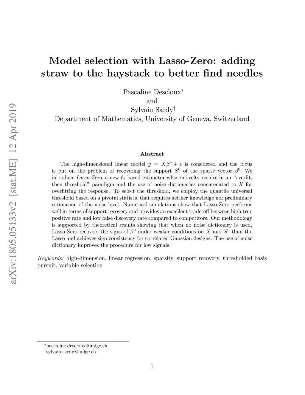 The high-dimensional linear model is considered and the focus is put on the problem of recovering the support of the sparse vector We introduce Lasso-Zero, a new -based estimator whose novelty resides in an "overfit, then threshold" paradigm and the use of noise dictionaries concatenated to for overfitting the response. To select the threshold, we employ the quantile universal threshold based on a pivotal statistic that requires neither knowledge nor preliminary estimation of the noise level. Numerical simulations show that Lasso-Zero performs well in terms of support recovery and provides an excellent trade-off between high true positive rate and low false discovery rate compared to competitors. Our methodology is supported by theoretical results showing that when no noise dictionary is used, Lasso-Zero recovers the signs of under weaker conditions on and than the Lasso and achieves sign consistency for correlated Gaussian designs. The use of noise dictionary improves the procedure for low signals.