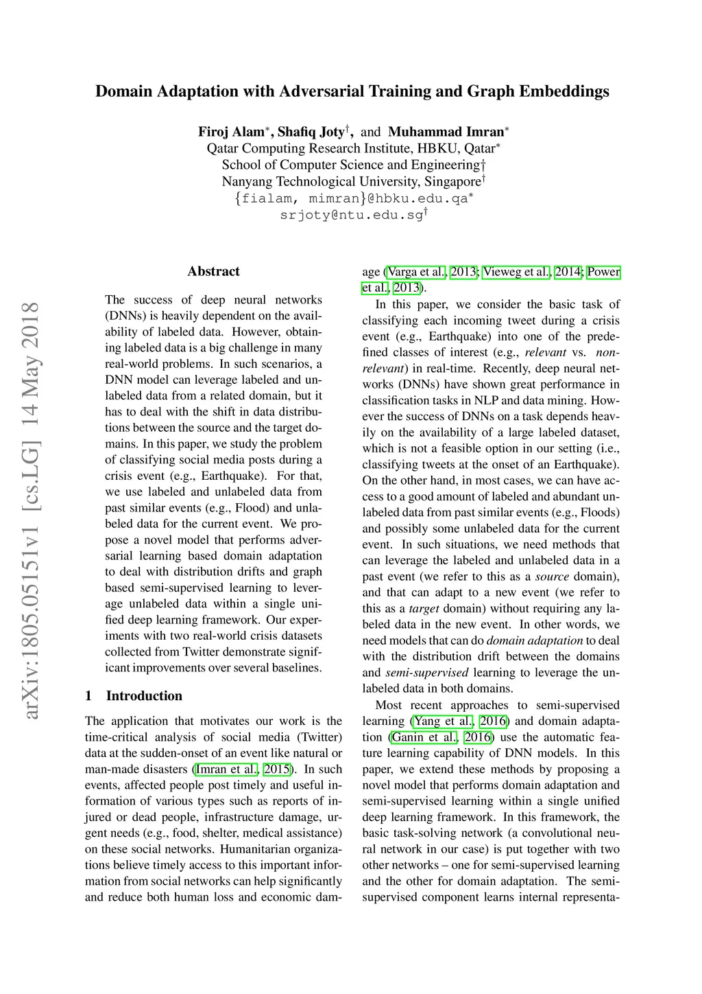The success of deep neural networks (DNNs) is heavily dependent on the availability of labeled data. However, obtaining labeled data is a big challenge in many real-world problems. In such scenarios, a DNN model can leverage labeled and unlabeled data from a related domain, but it has to deal with the shift in data distributions between the source and the target domains. In this paper, we study the problem of classifying social media posts during a crisis event (e.g., Earthquake). For that, we use labeled and unlabeled data from past similar events (e.g., Flood) and unlabeled data for the current event. We propose a novel model that performs adversarial learning based domain adaptation to deal with distribution drifts and graph based semi-supervised learning to leverage unlabeled data within a single unified deep learning framework. Our experiments with two real-world crisis datasets collected from Twitter demonstrate significant improvements over several baselines.