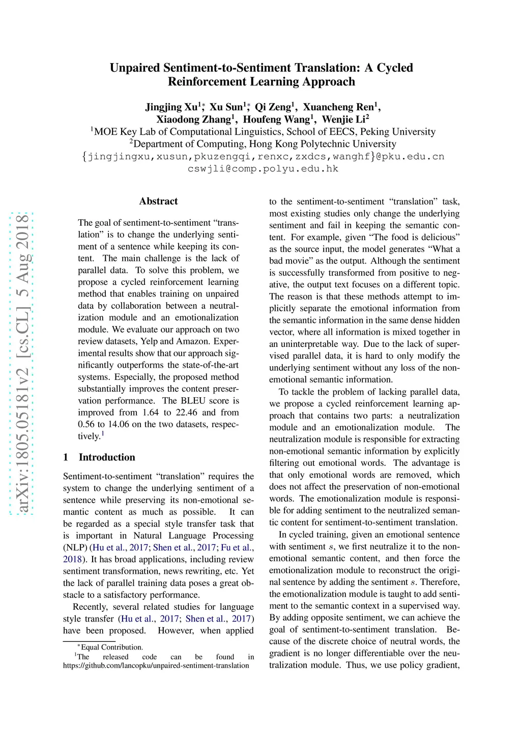 Unpaired Sentiment-to-Sentiment Translation: A Cycled Reinforcement