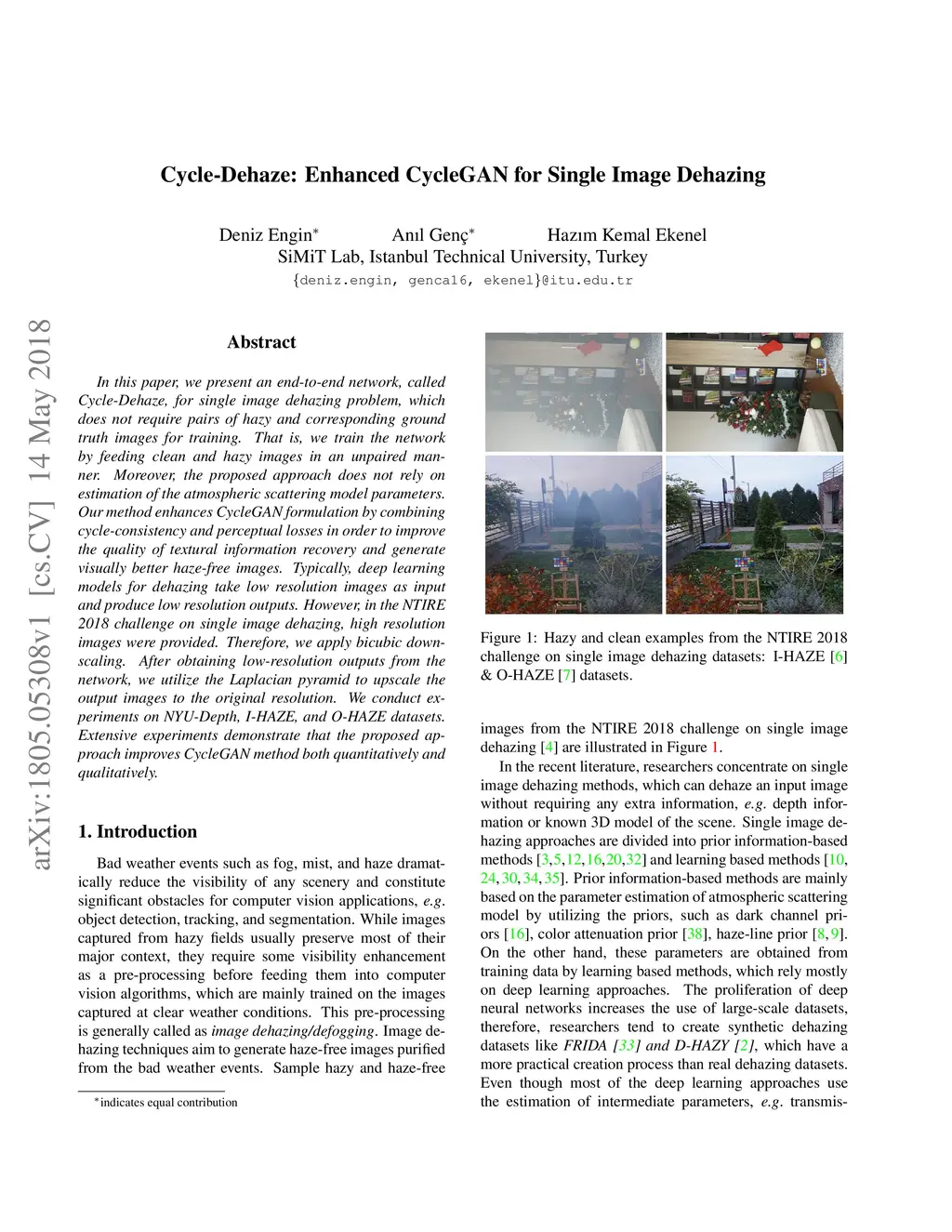 Cycle-Dehaze: Enhanced CycleGAN for Single Image Dehazing