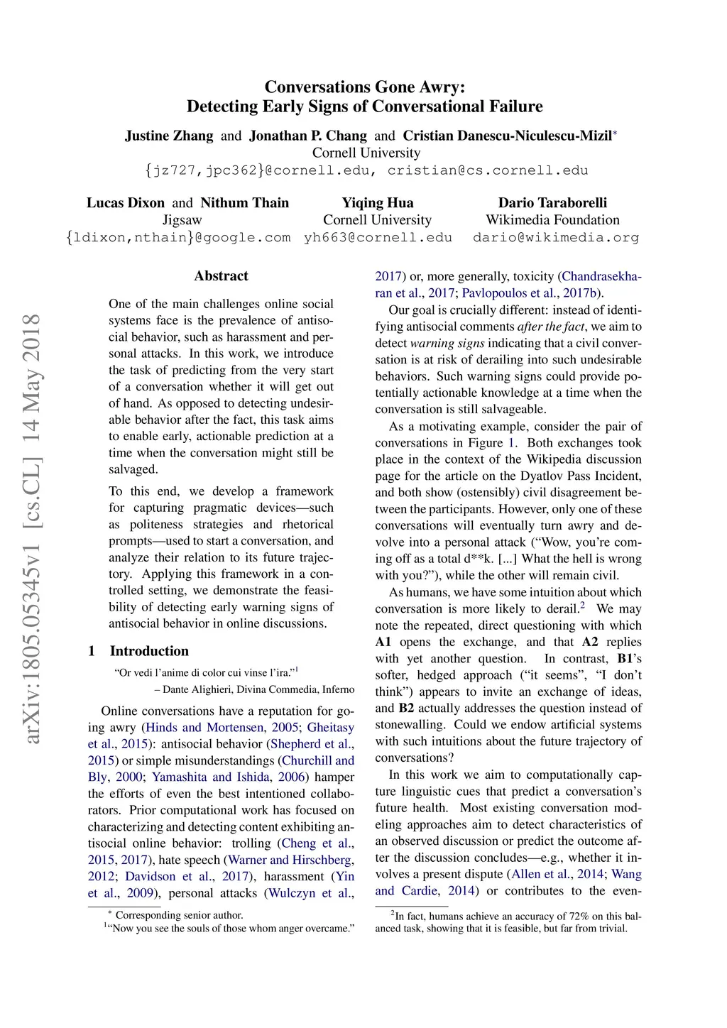 Conversations Gone Awry: Detecting Early Signs of Conversational Failure