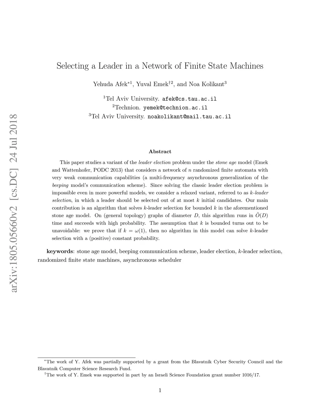 This paper studies a variant of the \emph{leader election} problem under the \emph{stone age} model (Emek and Wattenhofer, PODC 2013) that considers a network of randomized finite automata with very weak communication capabilities (a multi-frequency asynchronous generalization of the \emph{beeping} model's communication scheme). Since solving the classic leader election problem is impossible even in more powerful models, we consider a relaxed variant, referred to as \emph{-leader selection}, in which a leader should be selected out of at most initial candidates. Our main contribution is an algorithm that solves -leader selection for bounded in the aforementioned stone age model. On (general topology) graphs of diameter , this algorithm runs in time and succeeds with high probability. The assumption that is bounded turns out to be unavoidable: we prove that if , then no algorithm in this model can solve -leader selection with a (positive) constant probability.
