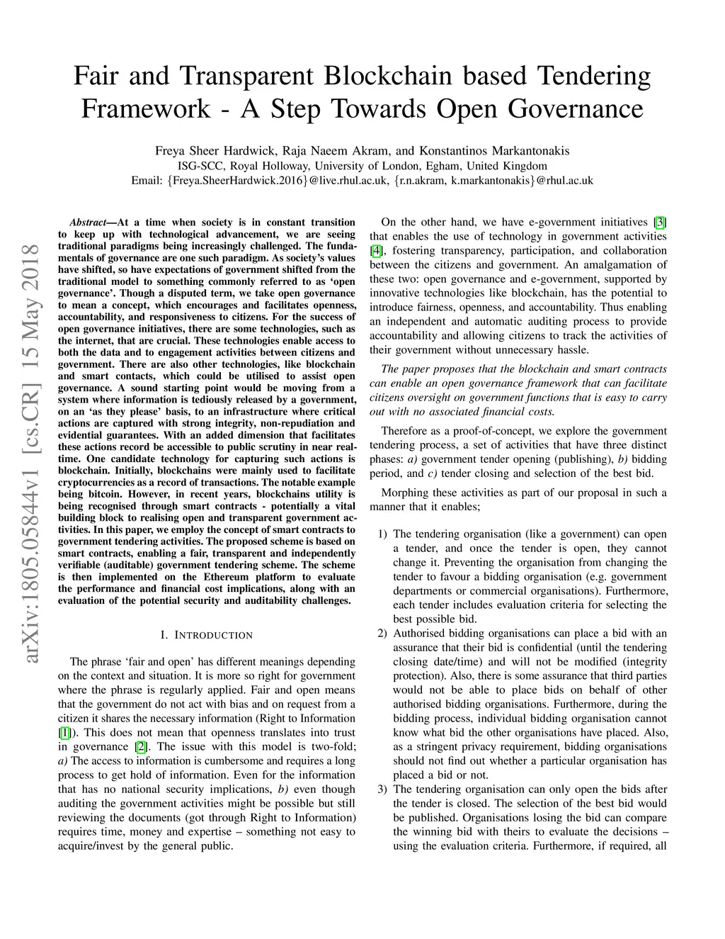 Society is in constant transition to keep up with technological advancement, we are seeing traditional paradigms being increasingly challenged. The fundamentals of governance are one such paradigm. As society's values have shifted, so have expectations of government shifted from the traditional model to something commonly referred to as ópen governance'. Though a disputed term, we take open governance to mean a concept, which encourages and facilitates openness, accountability, and responsiveness to citizens. For the success of open governance initiatives, there are some technologies, such as the internet, that are crucial. These technologies enable access to both the data and to engagement activities between citizens and government. There are also other technologies, like blockchain and smart contacts, which could be utilised to assist open governance. A sound starting point would be moving from a system where information is tediously released by a government, on an ás they please' basis, to an infrastructure where critical actions are captured with strong integrity, non-repudiation and evidential guarantees. With an added dimension that facilitates these actions record be accessible to public scrutiny in near real-time. One candidate technology for capturing such actions is blockchain. The blockchains utility is being recognised through smart contracts - potentially a vital building block to realising open and transparent government activities. In this paper, we employ the concept of smart contracts to government tendering activities. The proposed scheme is based on smart contracts, enabling a fair, transparent and independently verifiable (auditable) government tendering scheme. The scheme is then implemented on the Ethereum platform to evaluate the performance and financial cost implications, along with an evaluation of the potential security and auditability challenges.