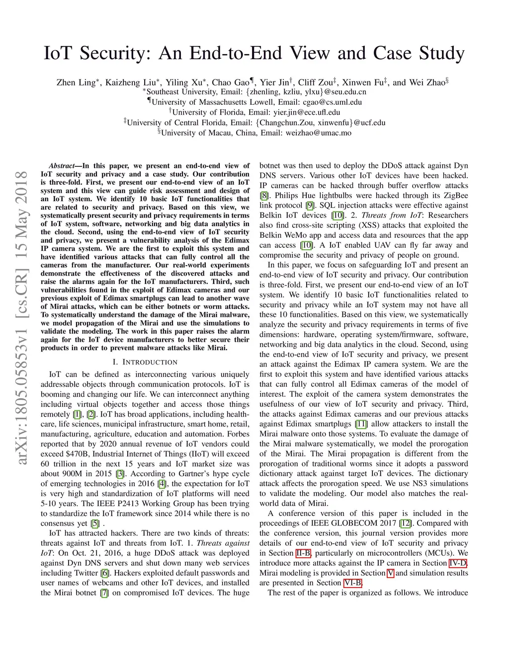 In this paper, we present an end-to-end view of IoT security and privacy and a case study. Our contribution is three-fold. First, we present our end-to-end view of an IoT system and this view can guide risk assessment and design of an IoT system. We identify 10 basic IoT functionalities that are related to security and privacy. Based on this view, we systematically present security and privacy requirements in terms of IoT system, software, networking and big data analytics in the cloud. Second, using the end-to-end view of IoT security and privacy, we present a vulnerability analysis of the Edimax IP camera system. We are the first to exploit this system and have identified various attacks that can fully control all the cameras from the manufacturer. Our real-world experiments demonstrate the effectiveness of the discovered attacks and raise the alarms again for the IoT manufacturers. Third, such vulnerabilities found in the exploit of Edimax cameras and our previous exploit of Edimax smartplugs can lead to another wave of Mirai attacks, which can be either botnets or worm attacks. To systematically understand the damage of the Mirai malware, we model propagation of the Mirai and use the simulations to validate the modeling. The work in this paper raises the alarm again for the IoT device manufacturers to better secure their products in order to prevent malware attacks like Mirai.