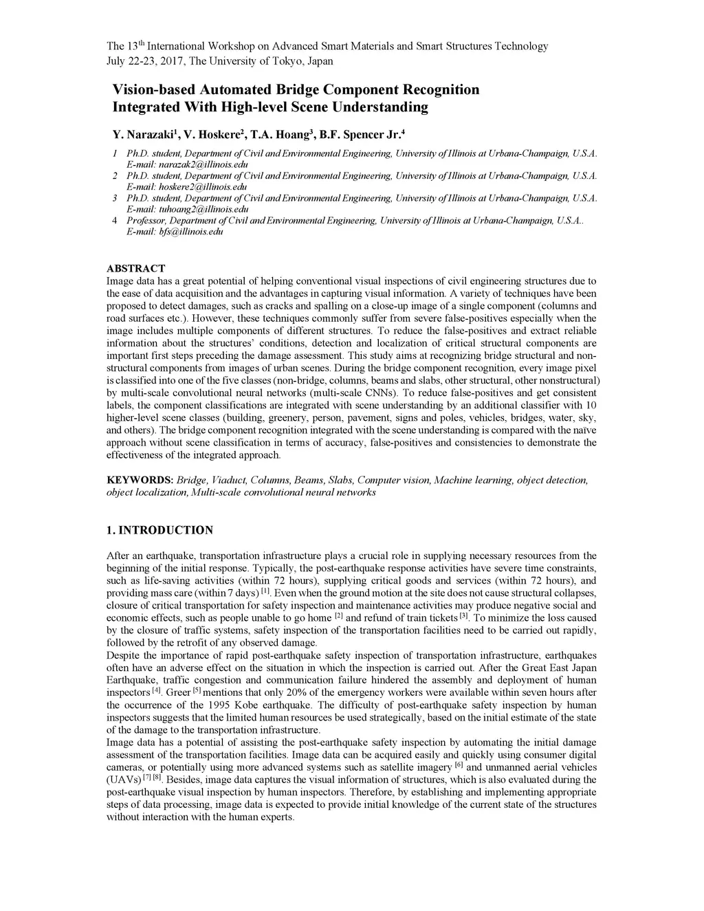 Image data has a great potential of helping conventional visual inspections of civil engineering structures due to the ease of data acquisition and the advantages in capturing visual information. A variety of techniques have been proposed to detect damages, such as cracks and spalling on a close-up image of a single component (columns and road surfaces etc.). However, these techniques commonly suffer from severe false-positives especially when the image includes multiple components of different structures. To reduce the false-positives and extract reliable information about the structures' conditions, detection and localization of critical structural components are important first steps preceding the damage assessment. This study aims at recognizing bridge structural and non-structural components from images of urban scenes. During the bridge component recognition, every image pixel is classified into one of the five classes (non-bridge, columns, beams and slabs, other structural, other nonstructural) by multi-scale convolutional neural networks (multi-scale CNNs). To reduce false-positives and get consistent labels, the component classifications are integrated with scene understanding by an additional classifier with 10 higher-level scene classes (building, greenery, person, pavement, signs and poles, vehicles, bridges, water, sky, and others). The bridge component recognition integrated with the scene understanding is compared with the naive approach without scene classification in terms of accuracy, false-positives and consistencies to demonstrate the effectiveness of the integrated approach.