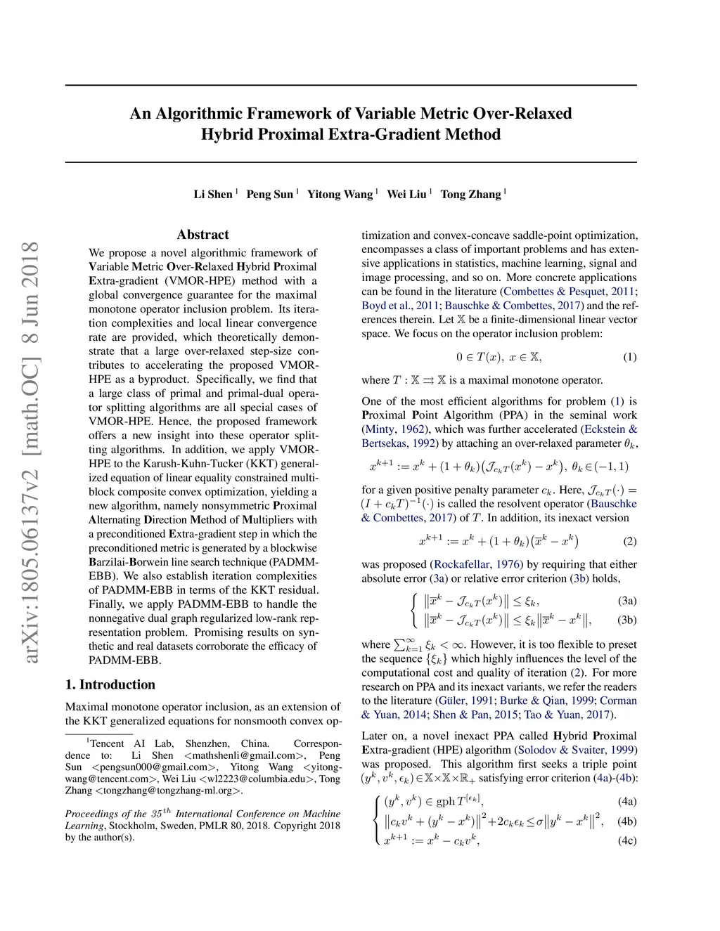 We propose a novel algorithmic framework of {\bf V}ariable {\bf M}etric {\bf O}ver-{\bf R}elaxed {\bf H}ybrid {\bf P}roximal {\bf E}xtra-gradient (VMOR-HPE) method with a global convergence guarantee for the maximal monotone operator inclusion problem. Its iteration complexities and local linear convergence rate are provided, which theoretically demonstrate that a large over-relaxed step-size contributes to accelerating the proposed VMOR-HPE as a byproduct. Specifically, we find that a large class of primal and primal-dual operator splitting algorithms are all special cases of VMOR-HPE. Hence, the proposed framework offers a new insight into these operator splitting algorithms. In addition, we apply VMOR-HPE to the Karush-Kuhn-Tucker (KKT) generalized equation of linear equality constrained multi-block composite convex optimization, yielding a new algorithm, namely nonsymmetric {\bf P}roximal {\bf A}lternating {\bf D}irection {\bf M}ethod of {\bf M}ultipliers with a preconditioned {\bf E}xtra-gradient step in which the preconditioned metric is generated by a blockwise {\bf B}arzilai-{\bf B}orwein line search technique (PADMM-EBB). We also establish iteration complexities of PADMM-EBB in terms of the KKT residual. Finally, we apply PADMM-EBB to handle the nonnegative dual graph regularized low-rank representation problem. Promising results on synthetic and real datasets corroborate the efficacy of PADMM-EBB.