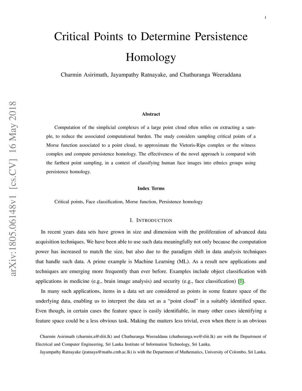 Computation of the simplicial complexes of a large point cloud often relies on extracting a sample, to reduce the associated computational burden. The study considers sampling critical points of a Morse function associated to a point cloud, to approximate the Vietoris-Rips complex or the witness complex and compute persistence homology. The effectiveness of the novel approach is compared with the farthest point sampling, in a context of classifying human face images into ethnics groups using persistence homology.