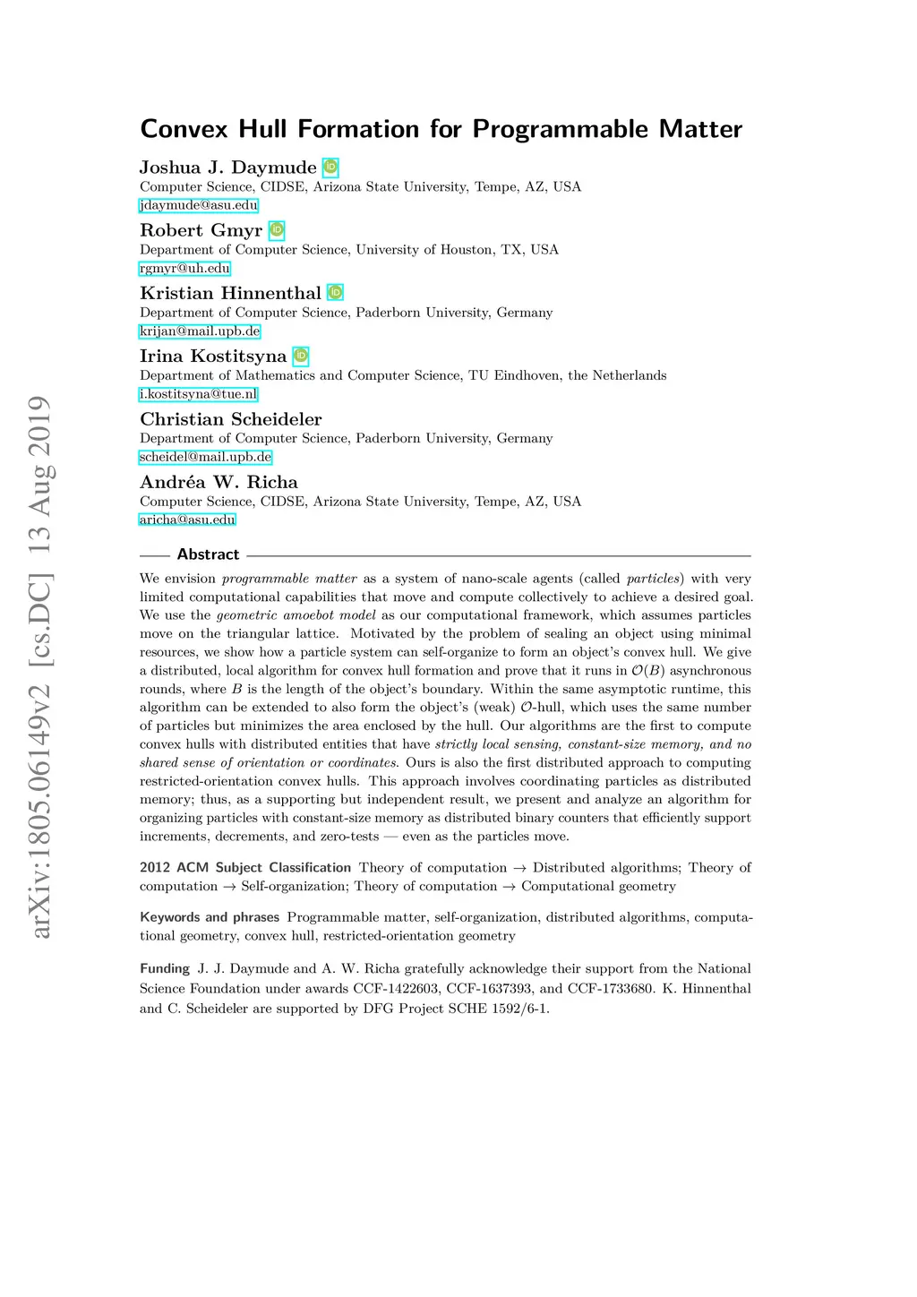 We envision programmable matter as a system of nano-scale agents (called particles) with very limited computational capabilities that move and compute collectively to achieve a desired goal. We use the geometric amoebot model as our computational framework, which assumes particles move on the triangular lattice. Motivated by the problem of sealing an object using minimal resources, we show how a particle system can self-organize to form an object's convex hull. We give a distributed, local algorithm for convex hull formation and prove that it runs in asynchronous rounds, where is the length of the object's boundary. Within the same asymptotic runtime, this algorithm can be extended to also form the object's (weak) -hull, which uses the same number of particles but minimizes the area enclosed by the hull. Our algorithms are the first to compute convex hulls with distributed entities that have strictly local sensing, constant-size memory, and no shared sense of orientation or coordinates. Ours is also the first distributed approach to computing restricted-orientation convex hulls. This approach involves coordinating particles as distributed memory; thus, as a supporting but independent result, we present and analyze an algorithm for organizing particles with constant-size memory as distributed binary counters that efficiently support increments, decrements, and zero-tests --- even as the particles move.