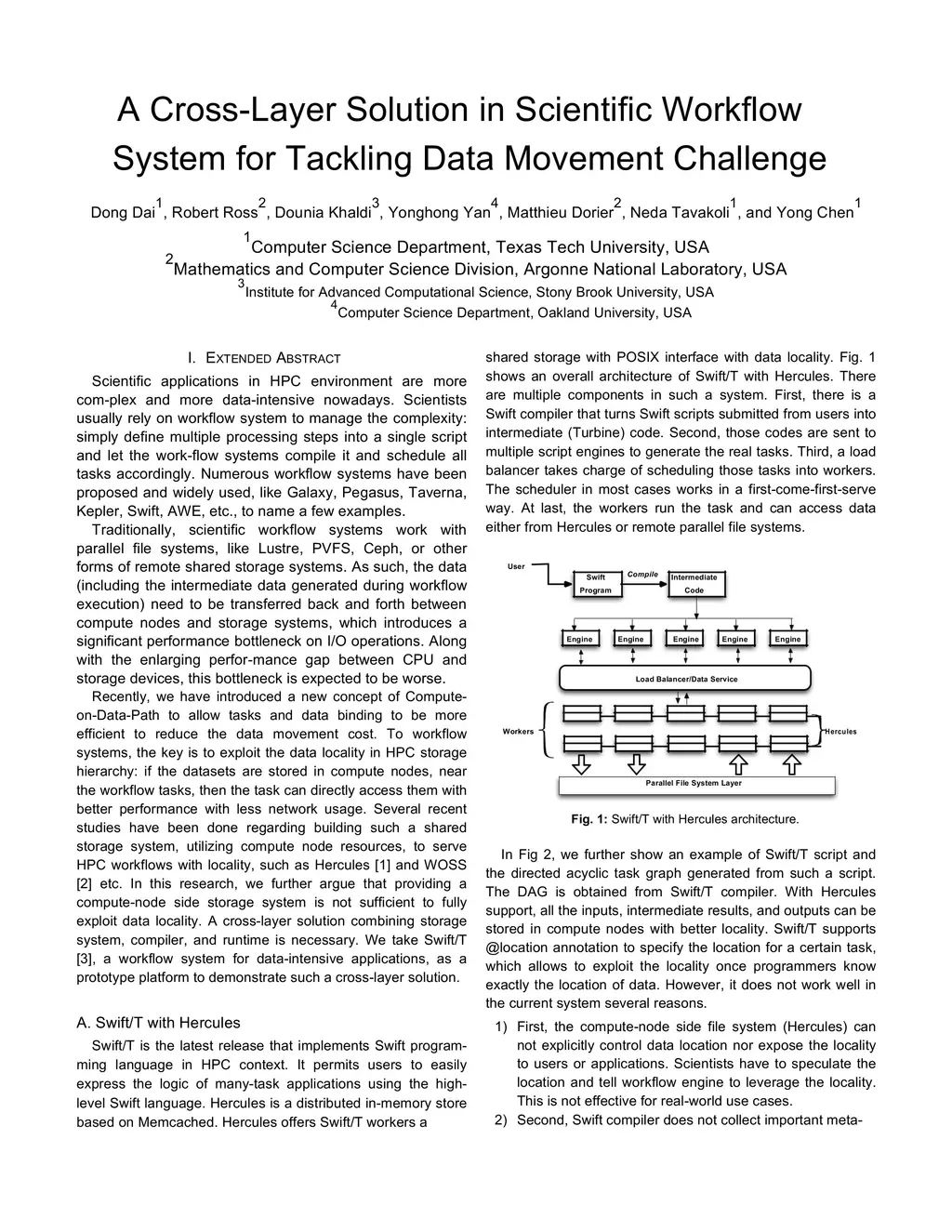 Scientific applications in HPC environment are more com-plex and more data-intensive nowadays. Scientists usually rely on workflow system to manage the complexity: simply define multiple processing steps into a single script and let the work-flow systems compile it and schedule all tasks accordingly. Numerous workflow systems have been proposed and widely used, like Galaxy, Pegasus, Taverna, Kepler, Swift, AWE, etc., to name a few examples. Traditionally, scientific workflow systems work with parallel file systems, like Lustre, PVFS, Ceph, or other forms of remote shared storage systems. As such, the data (including the intermediate data generated during workflow execution) need to be transferred back and forth between compute nodes and storage systems, which introduces a significant performance bottleneck on I/O operations. Along with the enlarging perfor-mance gap between CPU and storage devices, this bottleneck is expected to be worse. Recently, we have introduced a new concept of Compute-on-Data-Path to allow tasks and data binding to be more efficient to reduce the data movement cost. To workflow systems, the key is to exploit the data locality in HPC storage hierarchy: if the datasets are stored in compute nodes, near the workflow tasks, then the task can directly access them with better performance with less network usage. Several recent studies have been done regarding building such a shared storage system, utilizing compute node resources, to serve HPC workflows with locality, such as Hercules [1] and WOSS [2] etc. In this research, we further argue that providing a compute-node side storage system is not sufficient to fully exploit data locality. A cross-layer solution combining storage system, compiler, and runtime is necessary. We take Swift/T [3], a workflow system for data-intensive applications, as a prototype platform to demonstrate such a cross-layer solution