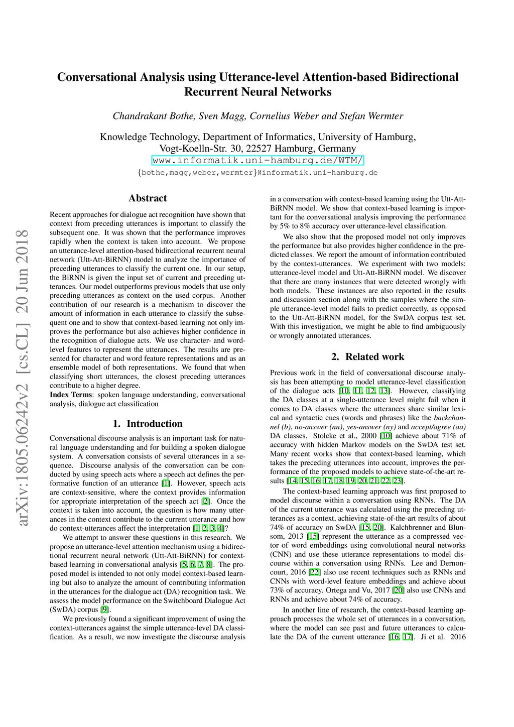 Recent approaches for dialogue act recognition have shown that context from preceding utterances is important to classify the subsequent one. It was shown that the performance improves rapidly when the context is taken into account. We propose an utterance-level attention-based bidirectional recurrent neural network (Utt-Att-BiRNN) model to analyze the importance of preceding utterances to classify the current one. In our setup, the BiRNN is given the input set of current and preceding utterances. Our model outperforms previous models that use only preceding utterances as context on the used corpus. Another contribution of the article is to discover the amount of information in each utterance to classify the subsequent one and to show that context-based learning not only improves the performance but also achieves higher confidence in the classification. We use character- and word-level features to represent the utterances. The results are presented for character and word feature representations and as an ensemble model of both representations. We found that when classifying short utterances, the closest preceding utterances contributes to a higher degree.