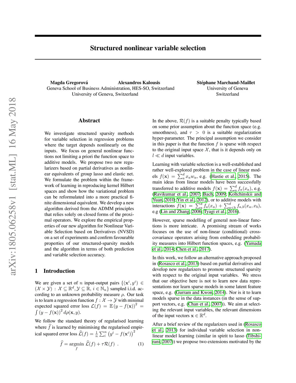 We investigate structured sparsity methods for variable selection in regression problems where the target depends nonlinearly on the inputs. We focus on general nonlinear functions not limiting a priori the function space to additive models. We propose two new regularizers based on partial derivatives as nonlinear equivalents of group lasso and elastic net. We formulate the problem within the framework of learning in reproducing kernel Hilbert spaces and show how the variational problem can be reformulated into a more practical finite dimensional equivalent. We develop a new algorithm derived from the ADMM principles that relies solely on closed forms of the proximal operators. We explore the empirical properties of our new algorithm for Nonlinear Variable Selection based on Derivatives (NVSD) on a set of experiments and confirm favourable properties of our structured-sparsity models and the algorithm in terms of both prediction and variable selection accuracy.