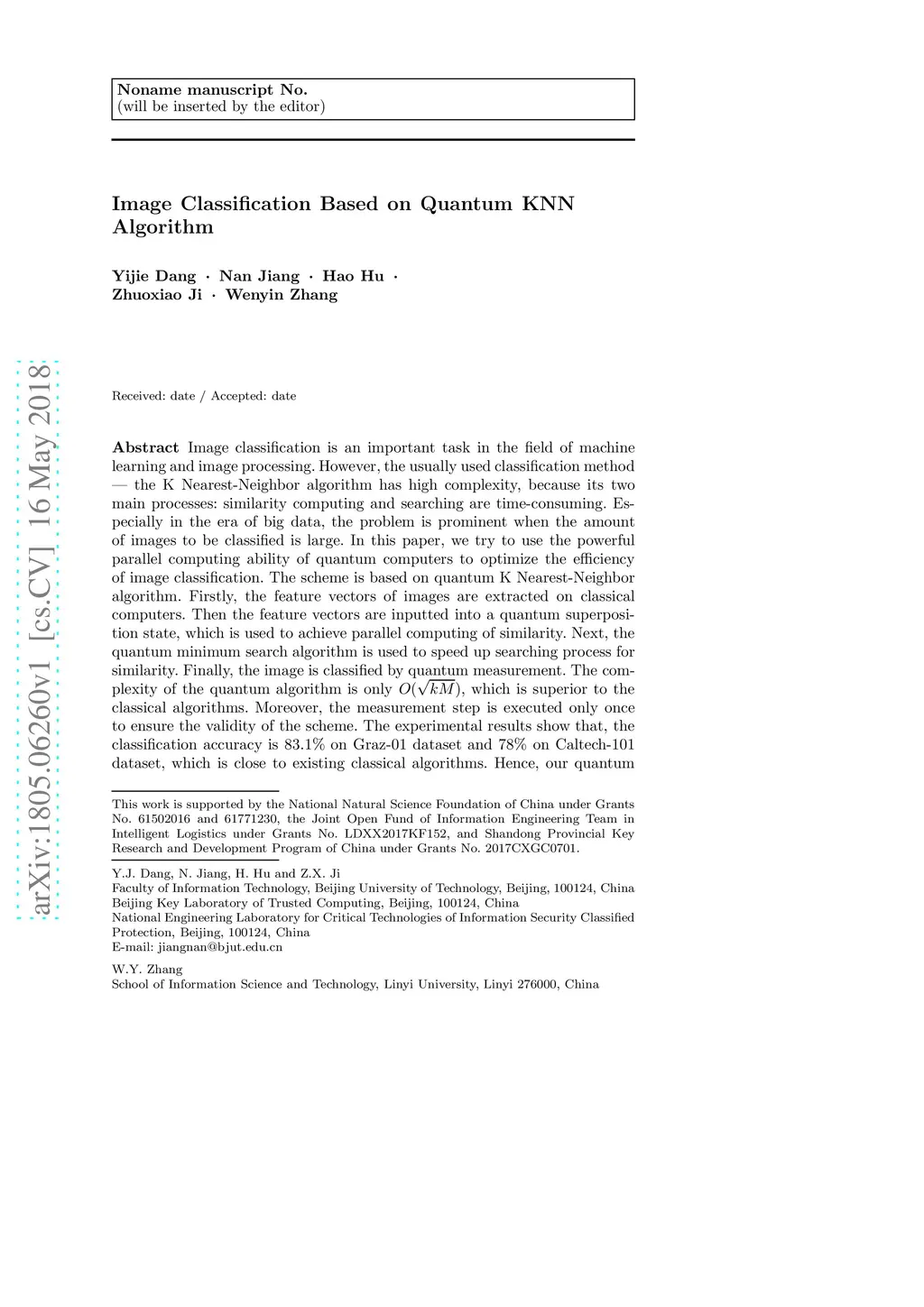 Image classification is an important task in the field of machine learning and image processing. However, the usually used classification method --- the K Nearest-Neighbor algorithm has high complexity, because its two main processes: similarity computing and searching are time-consuming. Especially in the era of big data, the problem is prominent when the amount of images to be classified is large. In this paper, we try to use the powerful parallel computing ability of quantum computers to optimize the efficiency of image classification. The scheme is based on quantum K Nearest-Neighbor algorithm. Firstly, the feature vectors of images are extracted on classical computers. Then the feature vectors are inputted into a quantum superposition state, which is used to achieve parallel computing of similarity. Next, the quantum minimum search algorithm is used to speed up searching process for similarity. Finally, the image is classified by quantum measurement. The complexity of the quantum algorithm is only O((kM)^(1/2)), which is superior to the classical algorithms. Moreover, the measurement step is executed only once to ensure the validity of the scheme. The experimental results show that, the classification accuracy is 83.1% on Graz-01 dataset and 78% on Caltech-101 dataset, which is close to existing classical algorithms. Hence, our quantum scheme has a good classification performance while greatly improving the efficiency.