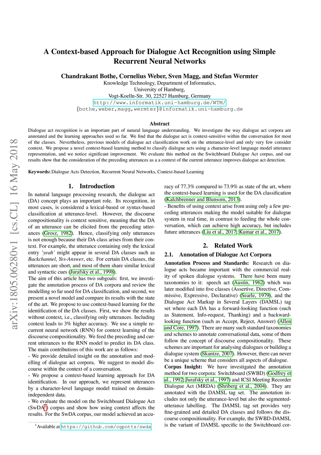 Dialogue act recognition is an important part of natural language understanding. We investigate the way dialogue act corpora are annotated and the learning approaches used so far. We find that the dialogue act is context-sensitive within the conversation for most of the classes. Nevertheless, previous models of dialogue act classification work on the utterance-level and only very few consider context. We propose a novel context-based learning method to classify dialogue acts using a character-level language model utterance representation, and we notice significant improvement. We evaluate this method on the Switchboard Dialogue Act corpus, and our results show that the consideration of the preceding utterances as a context of the current utterance improves dialogue act detection.