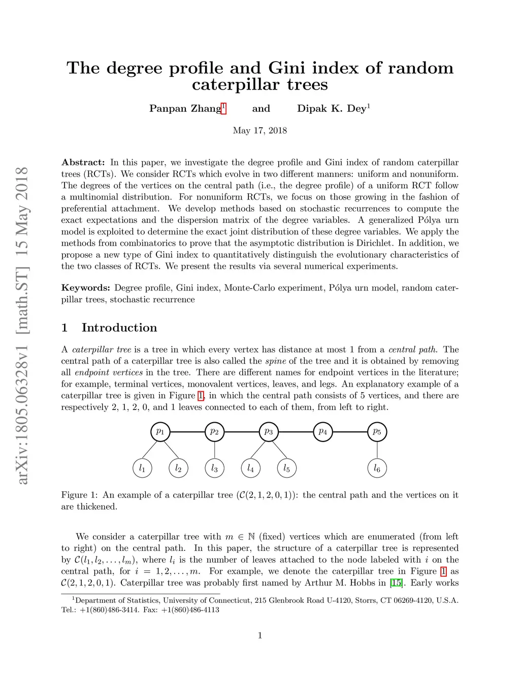 In this paper, we investigate the degree profile and Gini index of random caterpillar trees (RCTs). We consider RCTs which evolve in two different manners: uniform and nonuniform. The degrees of the vertices on the central path (i.e., the degree profile) of a uniform RCT follow a multinomial distribution. For nonuniform RCTs, we focus on those growing in the fashion of preferential attachment. We develop methods based on stochastic recurrences to compute the exact expectations and the dispersion matrix of the degree variables. A generalized P\'{o}lya urn model is exploited to determine the exact joint distribution of these degree variables. We apply the methods from combinatorics to prove that the asymptotic distribution is Dirichlet. In addition, we propose a new type of Gini index to quantitatively distinguish the evolutionary characteristics of the two classes of RCTs. We present the results via several numerical experiments.