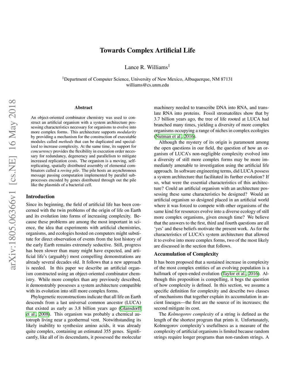 An object-oriented combinator chemistry was used to construct an artificial organism with a system architecture possessing characteristics necessary for organisms to evolve into more complex forms. This architecture supports modularity by providing a mechanism for the construction of executable modules called that can be duplicated and specialized to increase complexity. At the same time, its support for concurrency provides the flexibility in execution order necessary for redundancy, degeneracy and parallelism to mitigate increased replication costs. The organism is a moving, self-replicating, spatially distributed assembly of elemental combinators called a The pile hosts an asynchronous message passing computation implemented by parallel subprocesses encoded by genes distributed through out the pile like the plasmids of a bacterial cell.