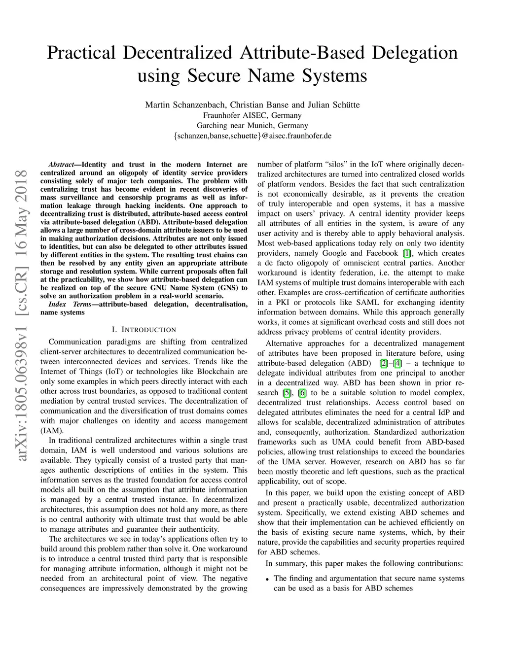 Identity and trust in the modern Internet are centralized around an oligopoly of identity service providers consisting solely of major tech companies. The problem with centralizing trust has become evident in recent discoveries of mass surveillance and censorship programs as well as information leakage through hacking incidents. One approach to decentralizing trust is distributed, attribute-based access control via attribute-based delegation (ABD). Attribute-based delegation allows a large number of cross-domain attribute issuers to be used in making authorization decisions. Attributes are not only issued to identities, but can also be delegated to other attributes issued by different entities in the system. The resulting trust chains can then be resolved by any entity given an appropriate attribute storage and resolution system. While current proposals often fail at the practicability, we show how attribute-based delegation can be realized on top of the secure GNU Name System (GNS) to solve an authorization problem in a real-world scenario.