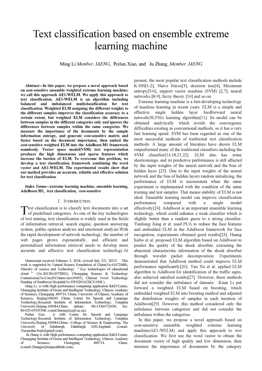 In this paper, we propose a novel approach based on cost-sensitive ensemble weighted extreme learning machine; we call this approach AE1-WELM. We apply this approach to text classification. AE1-WELM is an algorithm including balanced and imbalanced multiclassification for text classification. Weighted ELM assigning the different weights to the different samples improves the classification accuracy to a certain extent, but weighted ELM considers the differences between samples in the different categories only and ignores the differences between samples within the same categories. We measure the importance of the documents by the sample information entropy, and generate cost-sensitive matrix and factor based on the document importance, then embed the cost-sensitive weighted ELM into the AdaBoost.M1 framework seamlessly. Vector space model(VSM) text representation produces the high dimensions and sparse features which increase the burden of ELM. To overcome this problem, we develop a text classification framework combining the word vector and AE1-WELM. The experimental results show that our method provides an accurate, reliable and effective solution for text classification.