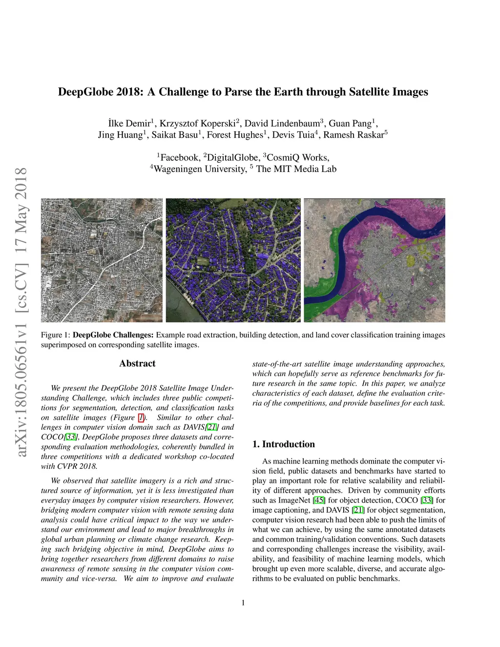 DeepGlobe 2018: A Challenge to Parse the Earth through Satellite Images