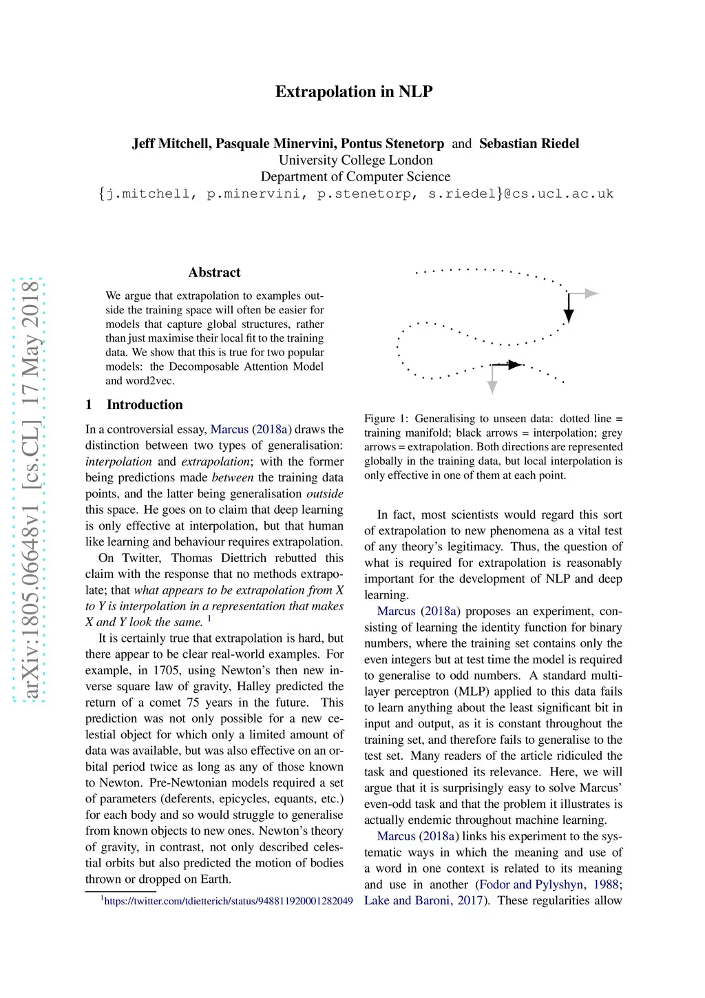 We argue that extrapolation to examples outside the training space will often be easier for models that capture global structures, rather than just maximise their local fit to the training data. We show that this is true for two popular models: the Decomposable Attention Model and word2vec.