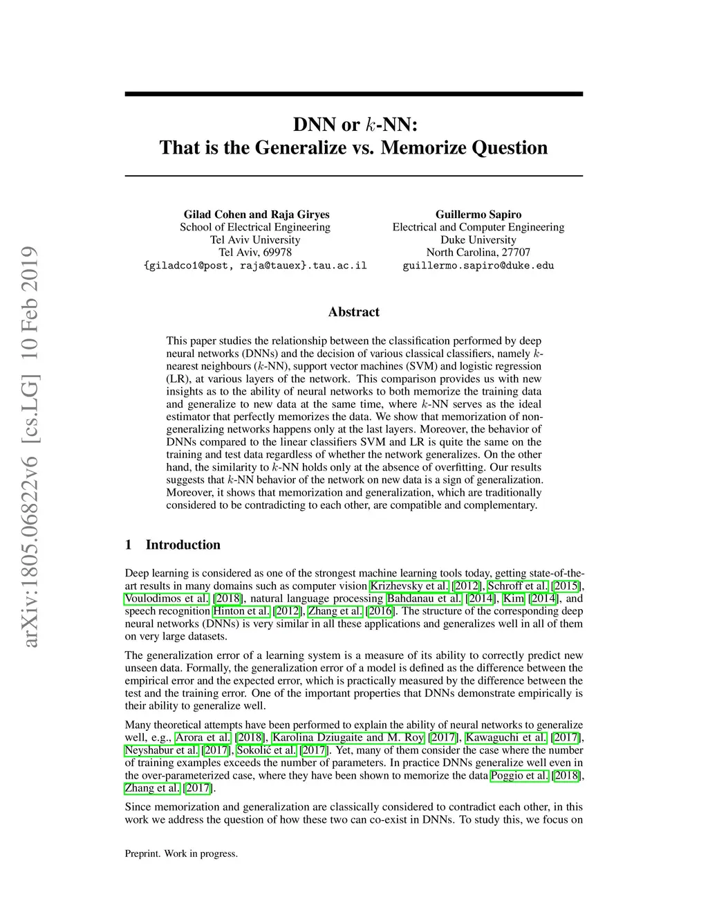 This paper studies the relationship between the classification performed by deep neural networks (DNNs) and the decision of various classical classifiers, namely k-nearest neighbours (k-NN), support vector machines (SVM) and logistic regression (LR), at various layers of the network. This comparison provides us with new insights as to the ability of neural networks to both memorize the training data and generalize to new data at the same time, where k-NN serves as the ideal estimator that perfectly memorizes the data. We show that memorization of non-generalizing networks happens only at the last layers. Moreover, the behavior of DNNs compared to the linear classifiers SVM and LR is quite the same on the training and test data regardless of whether the network generalizes. On the other hand, the similarity to k-NN holds only at the absence of overfitting. Our results suggests that k-NN behavior of the network on new data is a sign of generalization. Moreover, it shows that memorization and generalization, which are traditionally considered to be contradicting to each other, are compatible and complementary.