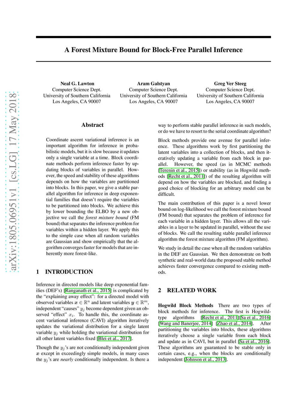 Coordinate ascent variational inference is an important algorithm for inference in probabilistic models, but it is slow because it updates only a single variable at a time. Block coordinate methods perform inference faster by updating blocks of variables in parallel. However, the speed and stability of these algorithms depends on how the variables are partitioned into blocks. In this paper, we give a stable parallel algorithm for inference in deep exponential families that doesn't require the variables to be partitioned into blocks. We achieve this by lower bounding the ELBO by a new objective we call the forest mixture bound (FM bound) that separates the inference problem for variables within a hidden layer. We apply this to the simple case when all random variables are Gaussian and show empirically that the algorithm converges faster for models that are inherently more forest-like.