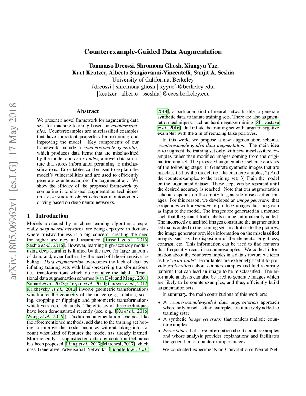 We present a novel framework for augmenting data sets for machine learning based on counterexamples. Counterexamples are misclassified examples that have important properties for retraining and improving the model. Key components of our framework include a counterexample generator, which produces data items that are misclassified by the model and error tables, a novel data structure that stores information pertaining to misclassifications. Error tables can be used to explain the model's vulnerabilities and are used to efficiently generate counterexamples for augmentation. We show the efficacy of the proposed framework by comparing it to classical augmentation techniques on a case study of object detection in autonomous driving based on deep neural networks.