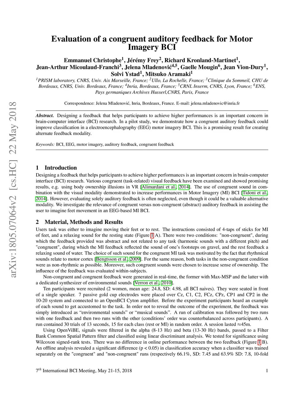 Evaluation of a congruent auditory feedback for Motor Imagery BCI