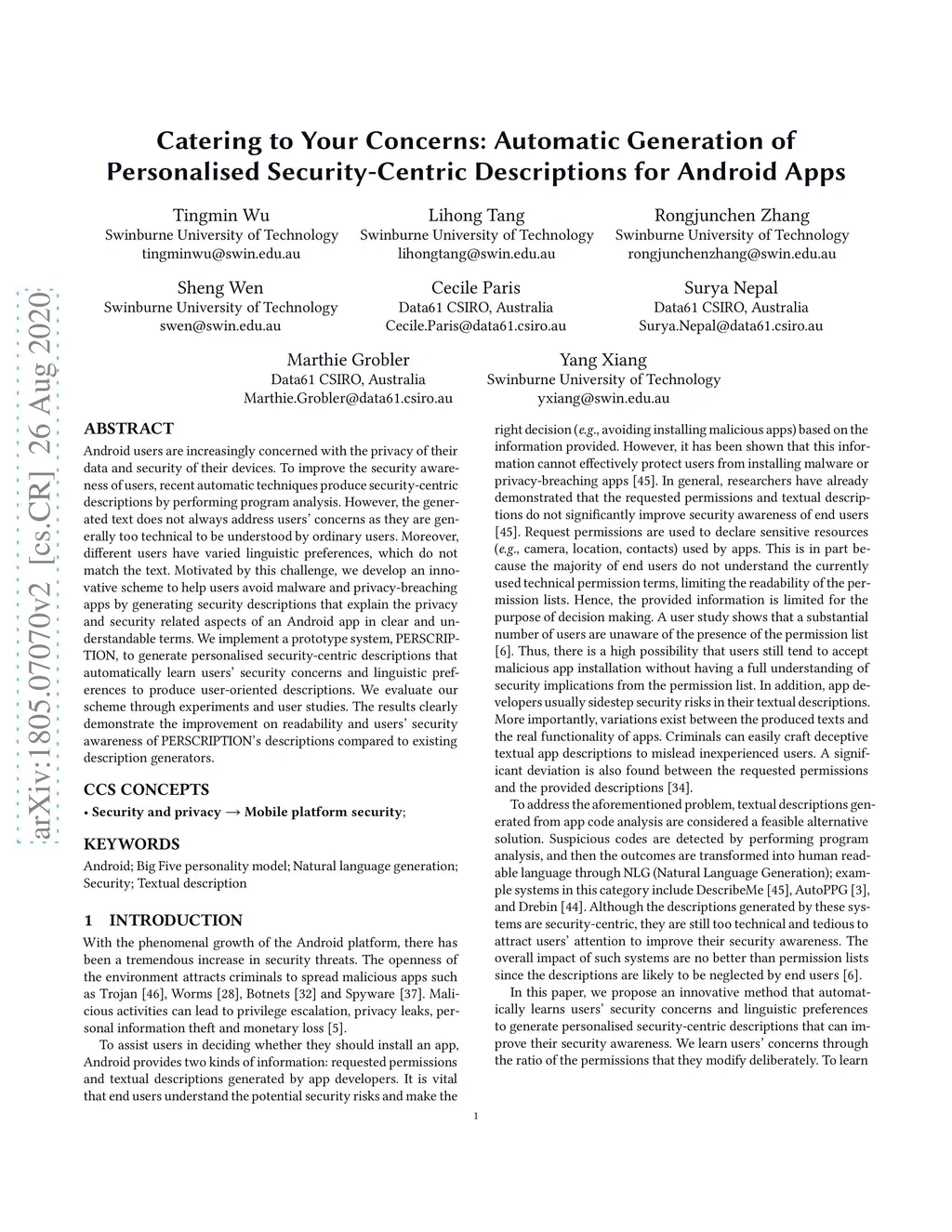 Android users are increasingly concerned with the privacy of their data and security of their devices. To improve the security awareness of users, recent automatic techniques produce security-centric descriptions by performing program analysis. However, the generated text does not always address users' concerns as they are generally too technical to be understood by ordinary users. Moreover, different users have varied linguistic preferences, which do not match the text. Motivated by this challenge, we develop an innovative scheme to help users avoid malware and privacy-breaching apps by generating security descriptions that explain the privacy and security related aspects of an Android app in clear and understandable terms. We implement a prototype system, PERSCRIPTION, to generate personalised security-centric descriptions that automatically learn users' security concerns and linguistic preferences to produce user-oriented descriptions. We evaluate our scheme through experiments and user studies. The results clearly demonstrate the improvement on readability and users' security awareness of PERSCRIPTION's descriptions compared to existing description generators.