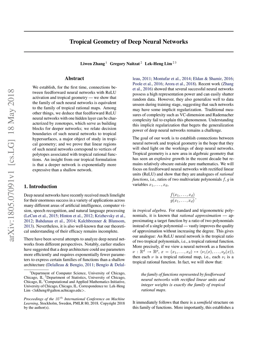 We establish, for the first time, connections between feedforward neural networks with ReLU activation and tropical geometry --- we show that the family of such neural networks is equivalent to the family of tropical rational maps. Among other things, we deduce that feedforward ReLU neural networks with one hidden layer can be characterized by zonotopes, which serve as building blocks for deeper networks; we relate decision boundaries of such neural networks to tropical hypersurfaces, a major object of study in tropical geometry; and we prove that linear regions of such neural networks correspond to vertices of polytopes associated with tropical rational functions. An insight from our tropical formulation is that a deeper network is exponentially more expressive than a shallow network.