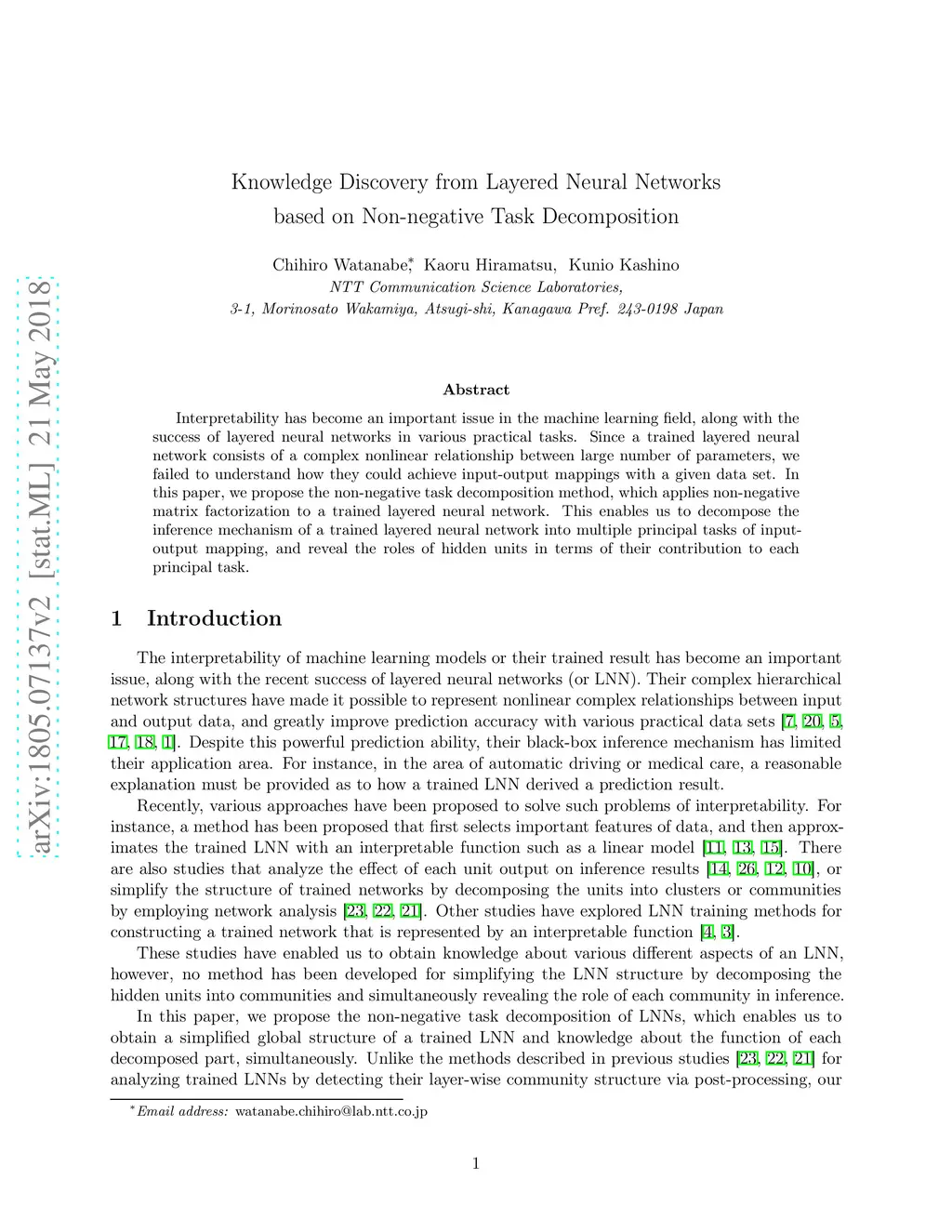 Interpretability has become an important issue in the machine learning field, along with the success of layered neural networks in various practical tasks. Since a trained layered neural network consists of a complex nonlinear relationship between large number of parameters, we failed to understand how they could achieve input-output mappings with a given data set. In this paper, we propose the non-negative task decomposition method, which applies non-negative matrix factorization to a trained layered neural network. This enables us to decompose the inference mechanism of a trained layered neural network into multiple principal tasks of input-output mapping, and reveal the roles of hidden units in terms of their contribution to each principal task.