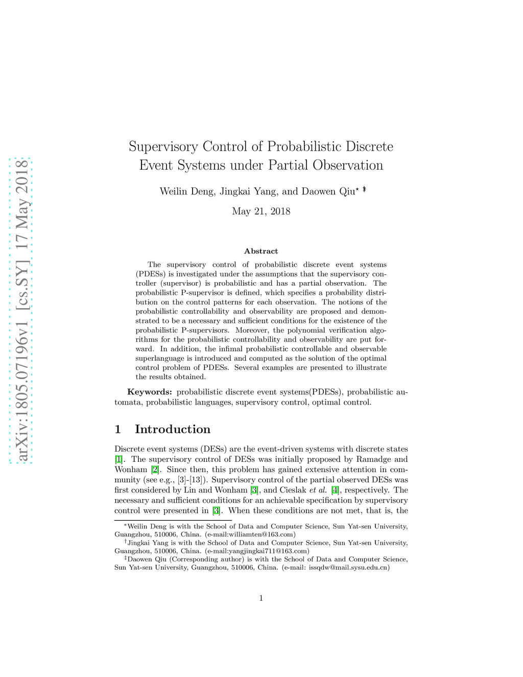 Supervisory Control of Probabilistic Discrete Event Systems under