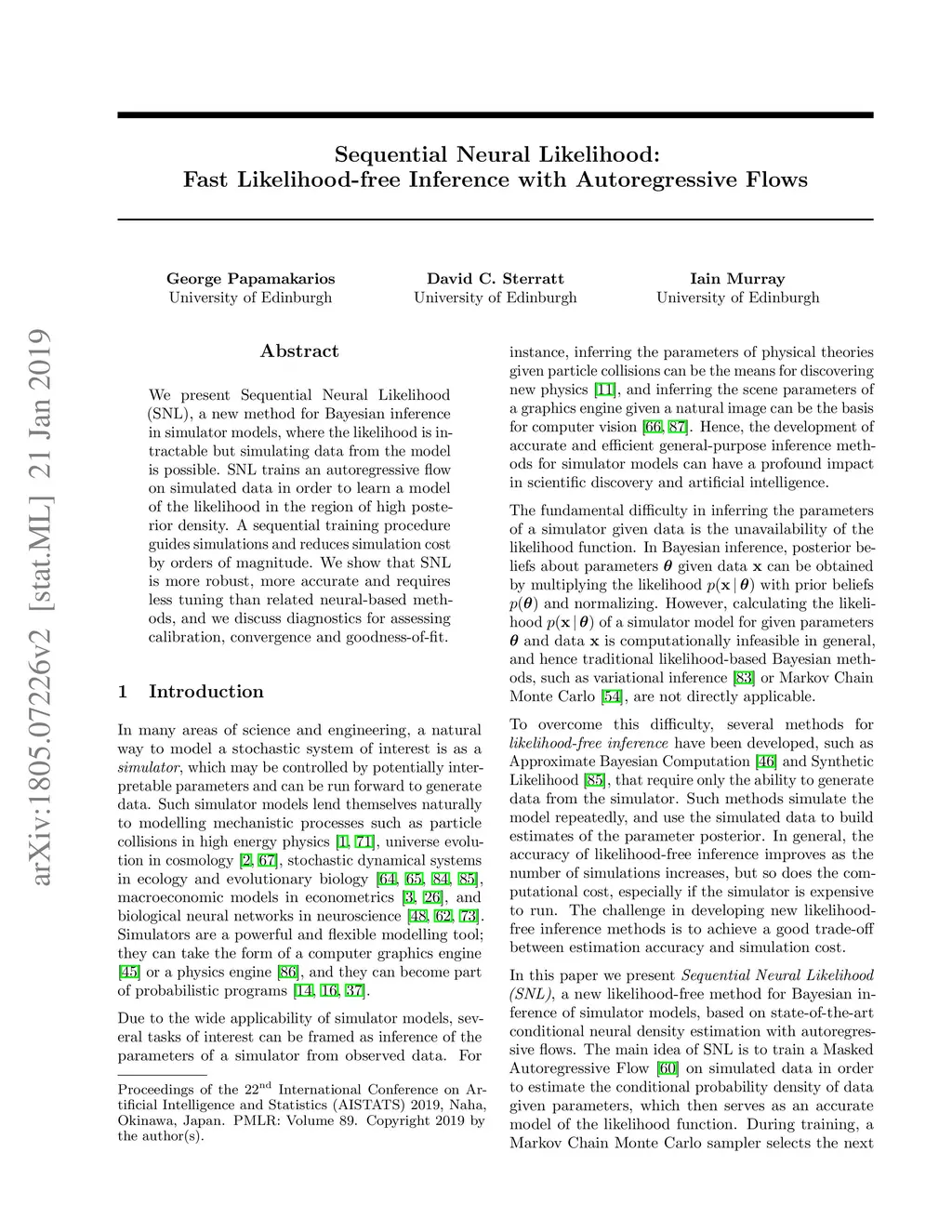 We present Sequential Neural Likelihood (SNL), a new method for Bayesian inference in simulator models, where the likelihood is intractable but simulating data from the model is possible. SNL trains an autoregressive flow on simulated data in order to learn a model of the likelihood in the region of high posterior density. A sequential training procedure guides simulations and reduces simulation cost by orders of magnitude. We show that SNL is more robust, more accurate and requires less tuning than related neural-based methods, and we discuss diagnostics for assessing calibration, convergence and goodness-of-fit.