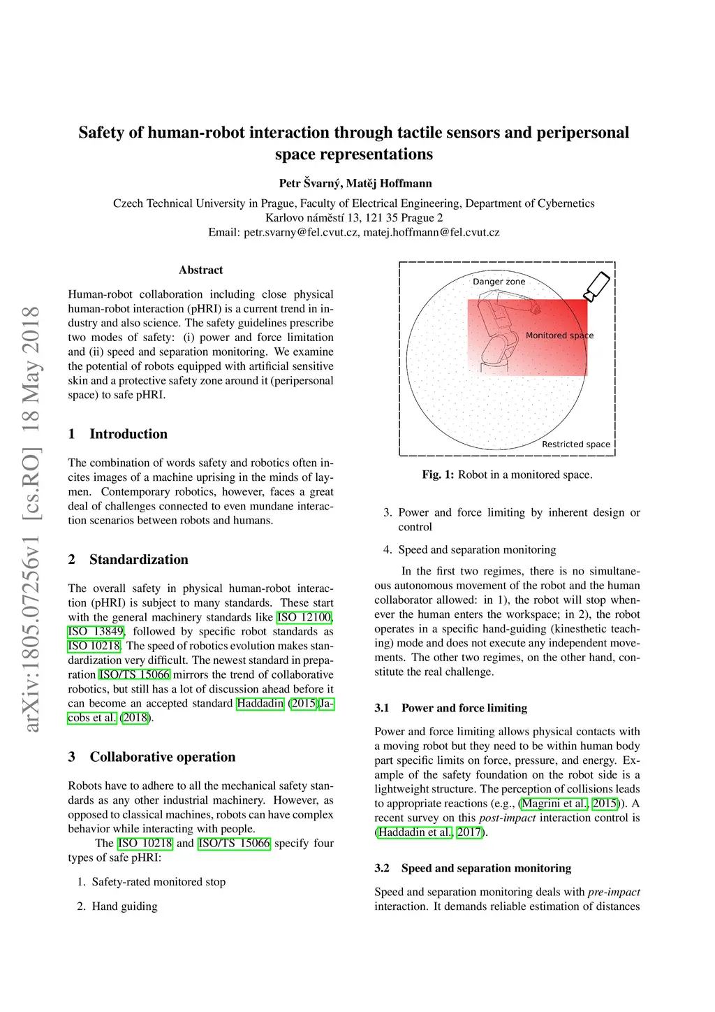 Human-robot collaboration including close physical human-robot interaction (pHRI) is a current trend in industry and also science. The safety guidelines prescribe two modes of safety: (i) power and force limitation and (ii) speed and separation monitoring. We examine the potential of robots equipped with artificial sensitive skin and a protective safety zone around it (peripersonal space) to safe pHRI.