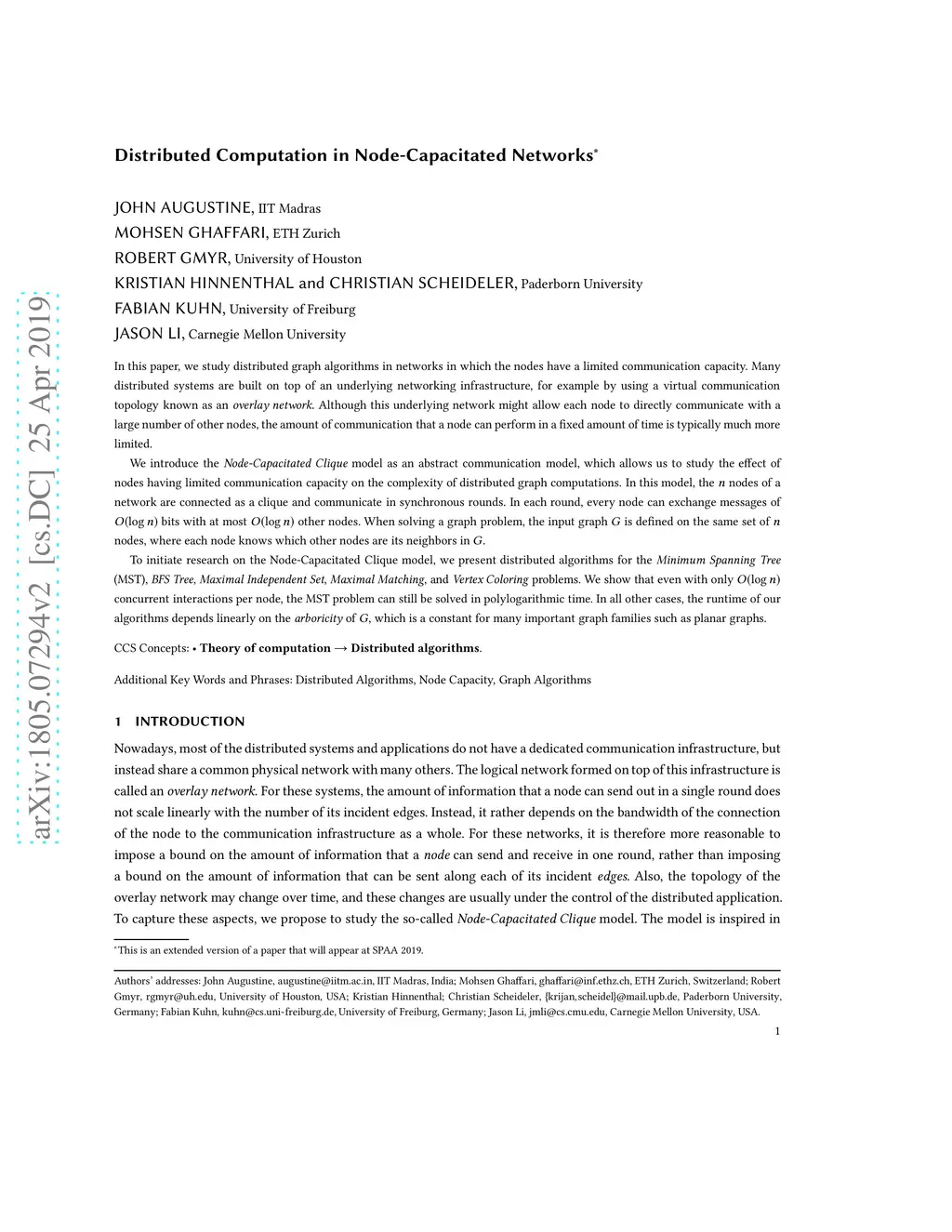 In this paper, we study distributed graph algorithms in networks in which the nodes have a limited communication capacity. Many distributed systems are built on top of an underlying networking infrastructure, for example by using a virtual communication topology known as an overlay network. Although this underlying network might allow each node to directly communicate with a large number of other nodes, the amount of communication that a node can perform in a fixed amount of time is typically much more limited. We introduce the Node-Capacitated Clique model as an abstract communication model, which allows us to study the effect of nodes having limited communication capacity on the complexity of distributed graph computations. In this model, the nodes of a network are connected as a clique and communicate in synchronous rounds. In each round, every node can exchange messages of bits with at most other nodes. When solving a graph problem, the input graph is defined on the same set of nodes, where each node knows which other nodes are its neighbors in . To initiate research on the Node-Capacitated Clique model, we present distributed algorithms for the Minimum Spanning Tree (MST), BFS Tree, Maximal Independent Set, Maximal Matching, and Vertex Coloring problems. We show that even with only concurrent interactions per node, the MST problem can still be solved in polylogarithmic time. In all other cases, the runtime of our algorithms depends linearly on the arboricity of , which is a constant for many important graph families such as planar graphs.