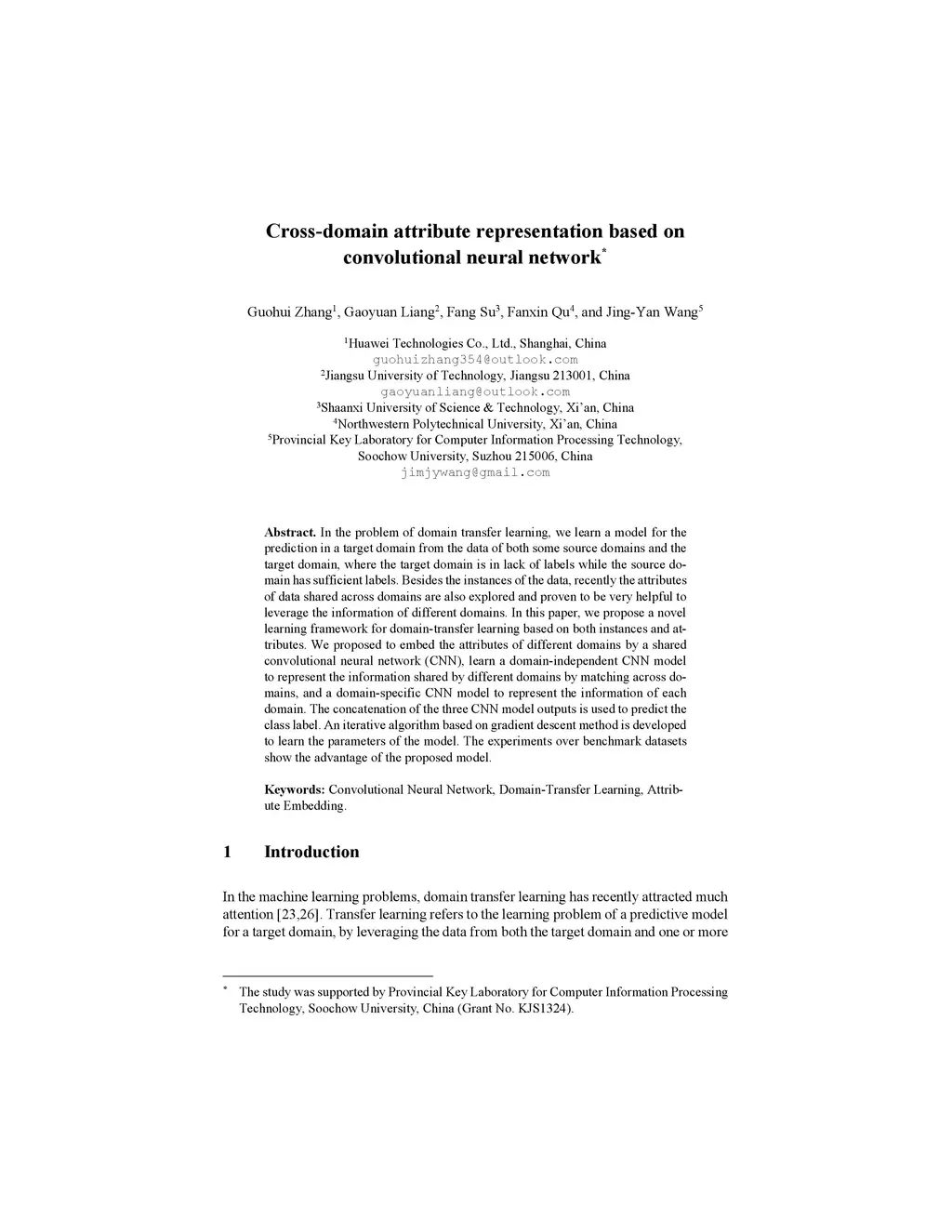In the problem of domain transfer learning, we learn a model for the predic-tion in a target domain from the data of both some source domains and the target domain, where the target domain is in lack of labels while the source domain has sufficient labels. Besides the instances of the data, recently the attributes of data shared across domains are also explored and proven to be very helpful to leverage the information of different domains. In this paper, we propose a novel learning framework for domain-transfer learning based on both instances and attributes. We proposed to embed the attributes of dif-ferent domains by a shared convolutional neural network (CNN), learn a domain-independent CNN model to represent the information shared by dif-ferent domains by matching across domains, and a domain-specific CNN model to represent the information of each domain. The concatenation of the three CNN model outputs is used to predict the class label. An iterative algo-rithm based on gradient descent method is developed to learn the parameters of the model. The experiments over benchmark datasets show the advantage of the proposed model.