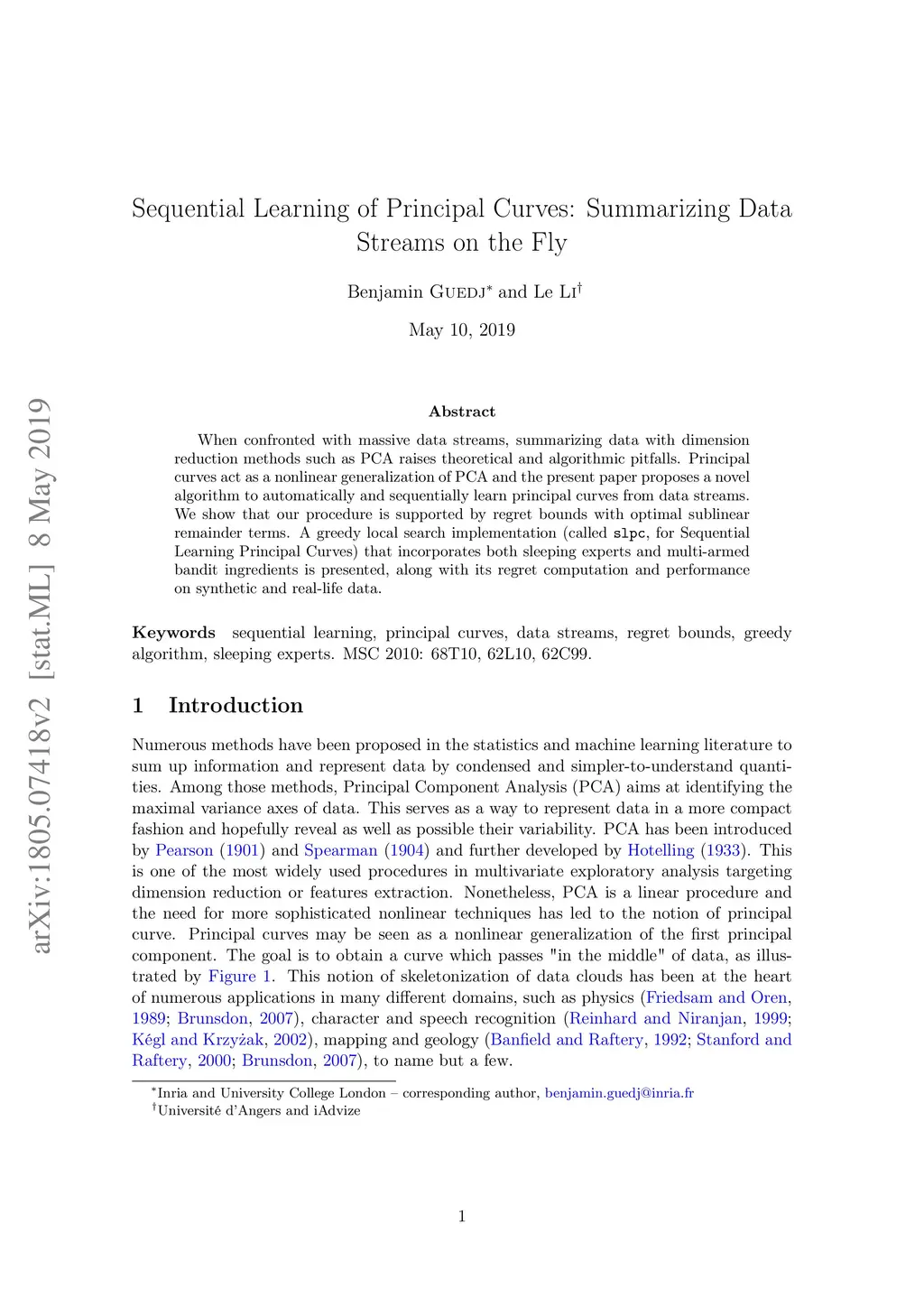 When confronted with massive data streams, summarizing data with dimension reduction methods such as PCA raises theoretical and algorithmic pitfalls. Principal curves act as a nonlinear generalization of PCA and the present paper proposes a novel algorithm to automatically and sequentially learn principal curves from data streams. We show that our procedure is supported by regret bounds with optimal sublinear remainder terms. A greedy local search implementation (called \texttt{slpc}, for Sequential Learning Principal Curves) that incorporates both sleeping experts and multi-armed bandit ingredients is presented, along with its regret computation and performance on synthetic and real-life data.