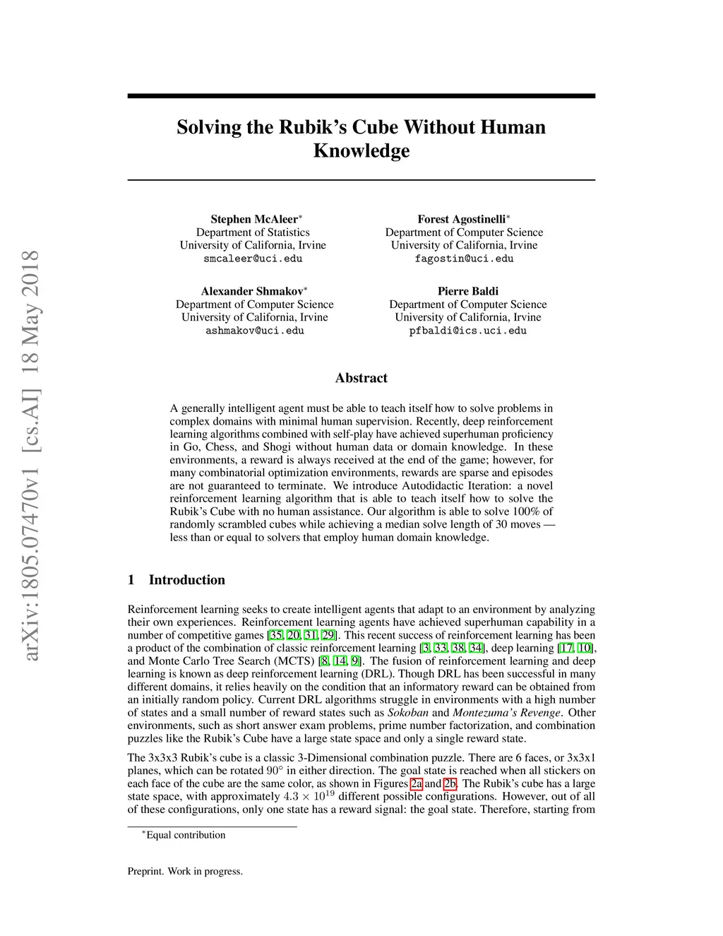 A generally intelligent agent must be able to teach itself how to solve problems in complex domains with minimal human supervision. Recently, deep reinforcement learning algorithms combined with self-play have achieved superhuman proficiency in Go, Chess, and Shogi without human data or domain knowledge. In these environments, a reward is always received at the end of the game, however, for many combinatorial optimization environments, rewards are sparse and episodes are not guaranteed to terminate. We introduce Autodidactic Iteration: a novel reinforcement learning algorithm that is able to teach itself how to solve the Rubik's Cube with no human assistance. Our algorithm is able to solve 100% of randomly scrambled cubes while achieving a median solve length of 30 moves -- less than or equal to solvers that employ human domain knowledge.