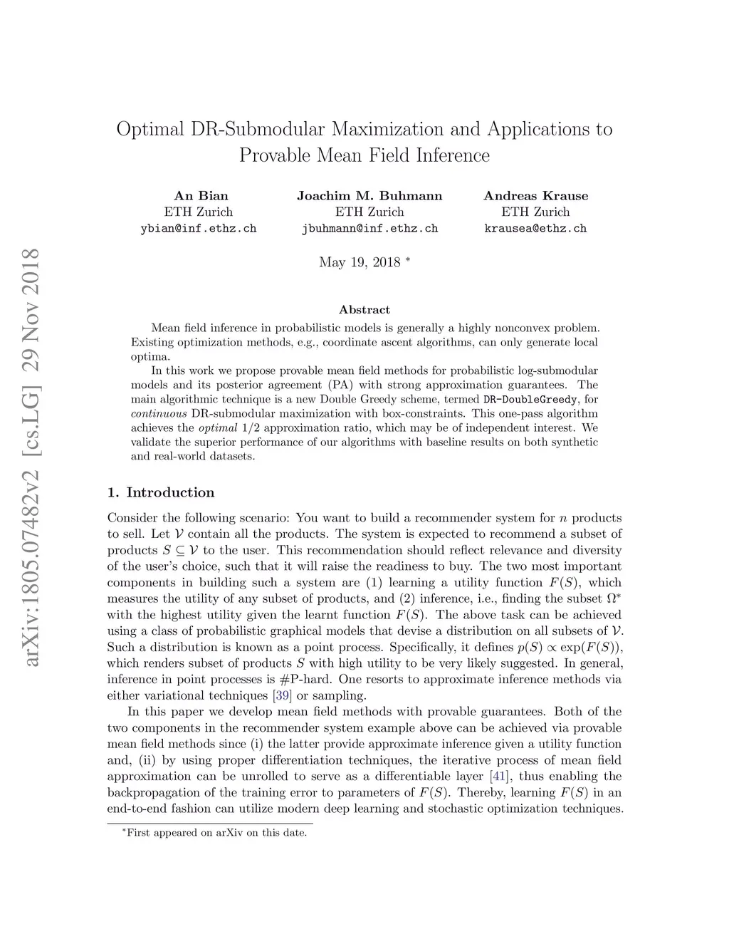 Mean field inference in probabilistic models is generally a highly nonconvex problem. Existing optimization methods, e.g., coordinate ascent algorithms, can only generate local optima. In this work we propose provable mean filed methods for probabilistic log-submodular models and its posterior agreement (PA) with strong approximation guarantees. The main algorithmic technique is a new Double Greedy scheme, termed DR-DoubleGreedy, for continuous DR-submodular maximization with box-constraints. It is a one-pass algorithm with linear time complexity, reaching the optimal 1/2 approximation ratio, which may be of independent interest. We validate the superior performance of our algorithms against baseline algorithms on both synthetic and real-world datasets.