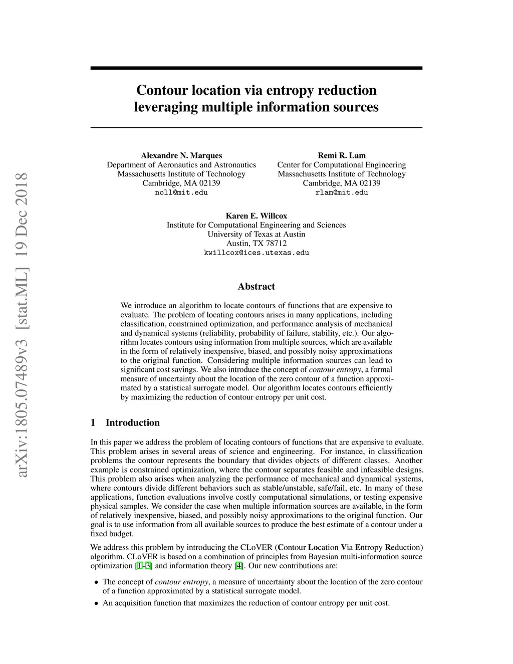 We introduce an algorithm to locate contours of functions that are expensive to evaluate. The problem of locating contours arises in many applications, including classification, constrained optimization, and performance analysis of mechanical and dynamical systems (reliability, probability of failure, stability, etc.). Our algorithm locates contours using information from multiple sources, which are available in the form of relatively inexpensive, biased, and possibly noisy approximations to the original function. Considering multiple information sources can lead to significant cost savings. We also introduce the concept of contour entropy, a formal measure of uncertainty about the location of the zero contour of a function approximated by a statistical surrogate model. Our algorithm locates contours efficiently by maximizing the reduction of contour entropy per unit cost.